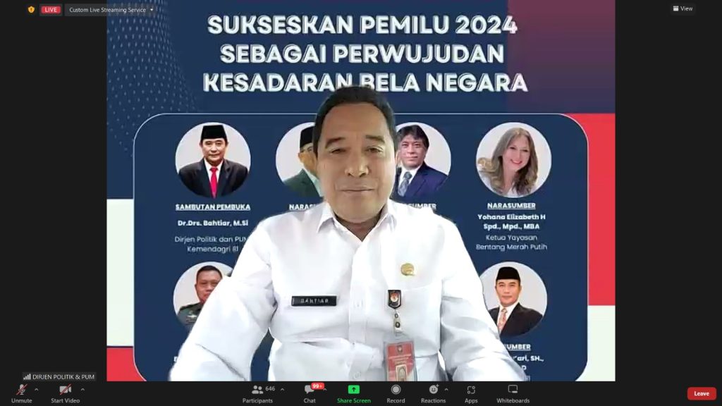 Dalam sambutannya, Direktur Jenderal (Dirjen) Polpum Kemendagri Bahtiar mengatakan, suksesnya gelaran Pemilu Serentak 2024 dapat menjadi salah satu indikator perwujudan kesadaran bela negara. Menurutnya, sebagai agenda negara, tahapan Pemilu kerap kali mengalami tantangan dan hambatan. Karena itu, kesadaran bela negara penting untuk ditumbuhkan.