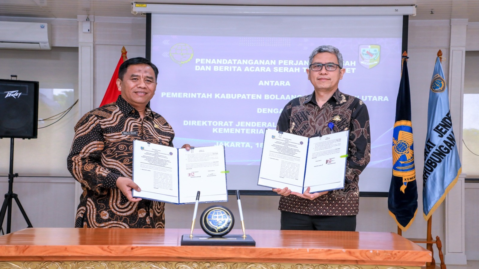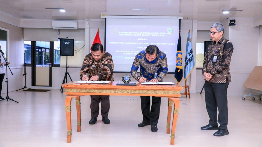DelikAsia.com, (Jakarta) | Kementerian Perhubungan melalui Direktorat Jenderal Perhubungan Laut menerima hibah Barang Milik Daerah berupa aset tanah seluas 9.173 m² dari Pemerintah Kabupaten Bolaang Mongondow Utara, Provinsi Sulawesi Utara. Penyerahan aset tanah tersebut ditandai dengan Penandatanganan berita acara sekaligus serah terima Barang Milik Daerah antara Bupati Bolaang Mongondow Utara dengan Sekretaris Direktorat Jenderal Perhubungan Laut di Kantor Kementerian Perhubungan Jakarta pada Senin (18/12).