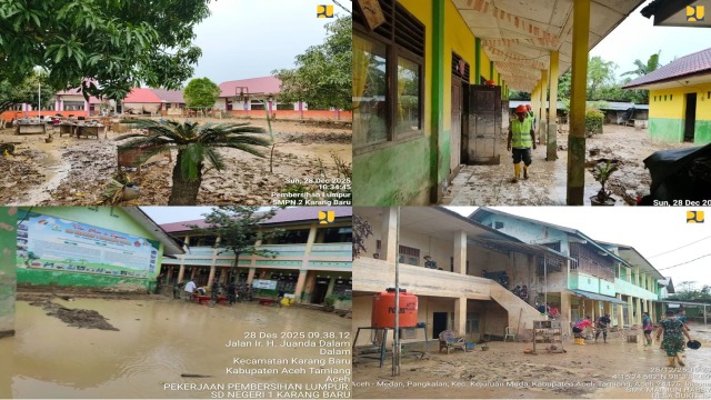 Berdasarkan data penanganan bencana di Sumatera per hari ini (29/12/2025), Kementerian PU melibatkan BUMN Karya PT Waskita Karya (Persero) Tbk untuk melakukan pembersihan di sejumlah sekolah, antara lain SMP Swasta Islam Ma’arif, SD Negeri 1 Kuala Simpang, serta SMK Maimun Habsyah. Pekerjaan difokuskan pada pembersihan ruang kelas, halaman sekolah, saluran drainase, dan area pendukung lainnya yang terdampak bencana.