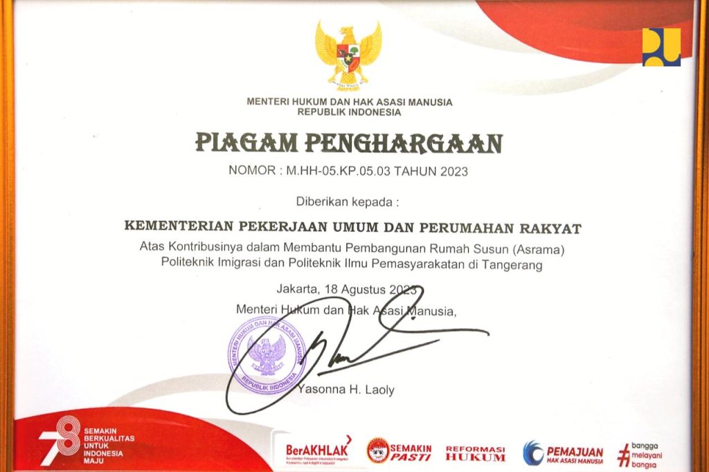 Jakarta, (DelikAsia.com) | Kementerian Pekerjaan Umum dan Perumahan Rakyat (PUPR) menerima penghargaan atas Pembangunan Rumah Susun (rusun) Politeknik Imigrasi dan Pemasyarakatan di Tangerang, dari Kementerian Hukum dan HAM (Kemenkumham) dalam Upacara Hari Kemenkumham, Hari Dharma Karya Dhika (HDKD) ke-78 di Jakarta, Senin (21/08/2023).