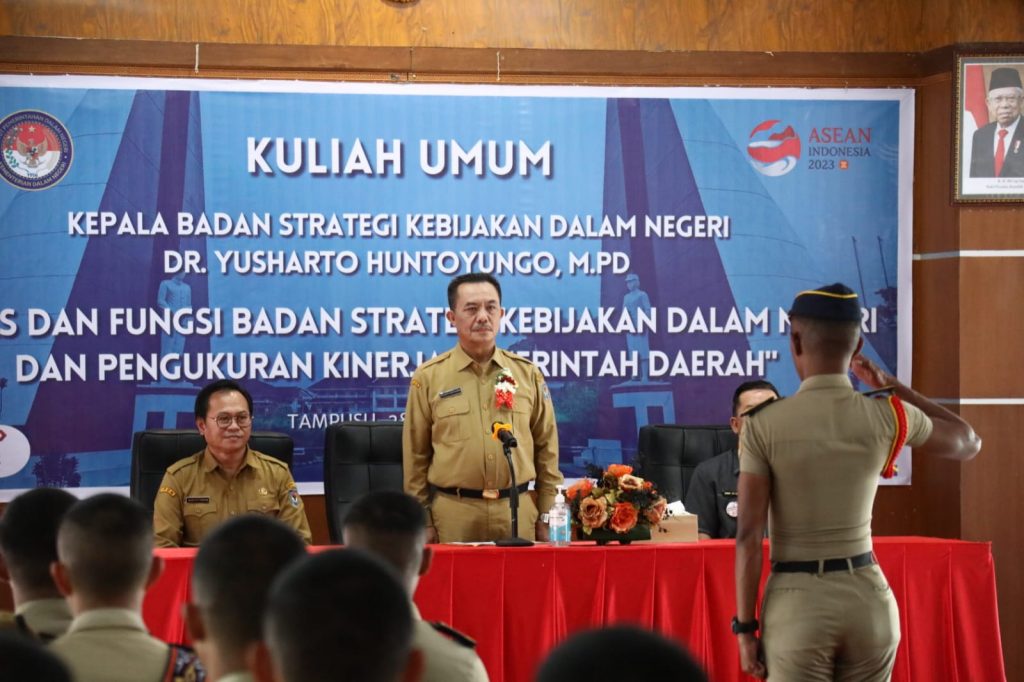 Saat menjadi narasumber kuliah umum dengan tema “Tugas dan Fungsi BSKDN” yang diselenggarakan oleh IPDN Sulawesi Utara (Sulut), Kepala Badan Strategi Kebijakan Dalam Negeri (BSKDN) Kemendagri Yusharto Huntoyungo menyampaikan sejumlah poin penting yang perlu diperhatikan mahasiswa IPDN. Di antaranya menguasai ilmu pengetahuan dan teknologi saat ini, sehingga kelak mereka dapat menjadi lulusan yang bermanfaat dan berdaya saing. Adapun acara tersebut berlangsung di IPDN Sulut, Selasa (28/3/2023).