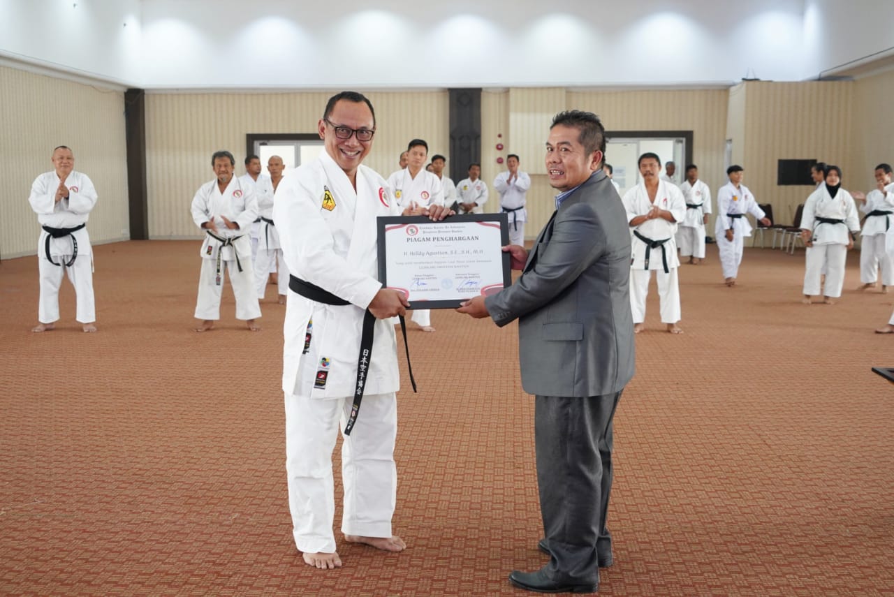 Cilegon, (DelikAsia.com) | Wali Kota Cilegon Helldy Agustian menerima penghargaan Sabuk Hitam Karate-Do dari Lembaga Karate-Do Indonesia (Lemkari) Banten, di Aula Diskominfo Kota Cilegon, Minggu 3 September 2023.