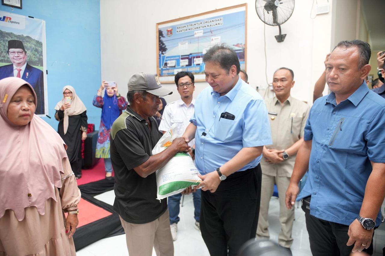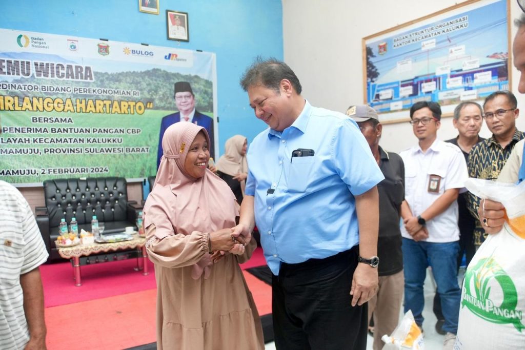 Menteri Koordinator Bidang Perekonomian Airlangga Hartarto kembali meninjau secara langsung kelancaran dan ketepatan sasaran penyaluran Bantuan Pangan sekaligus melakukan Temu Wicara dengan 100 Penerima Bantuan Pangan (PBP) di Kantor Kecamatan Kalukku, Kabupaten Mamuju.[SUMBER DAN FOTO: HUMAS EKON]. DelikAsia.com, (Kabupaten Mamuju) | Penyaluran beras bagi masyarakat melalui Program Bantuan Pangan ditujukan Pemerintah untuk menjaga daya beli masyarakat yang rentan terhadap dampak langsung kenaikan harga pangan. Sebagai salah satu bagian dari kebijakan Pemerintah terkait perlindungan sosial, Bantuan Pangan yang telah disalurkan sejak April 2023 tersebut, juga menjadi peranti Pemerintah dalam menekan laju inflasi nasional.