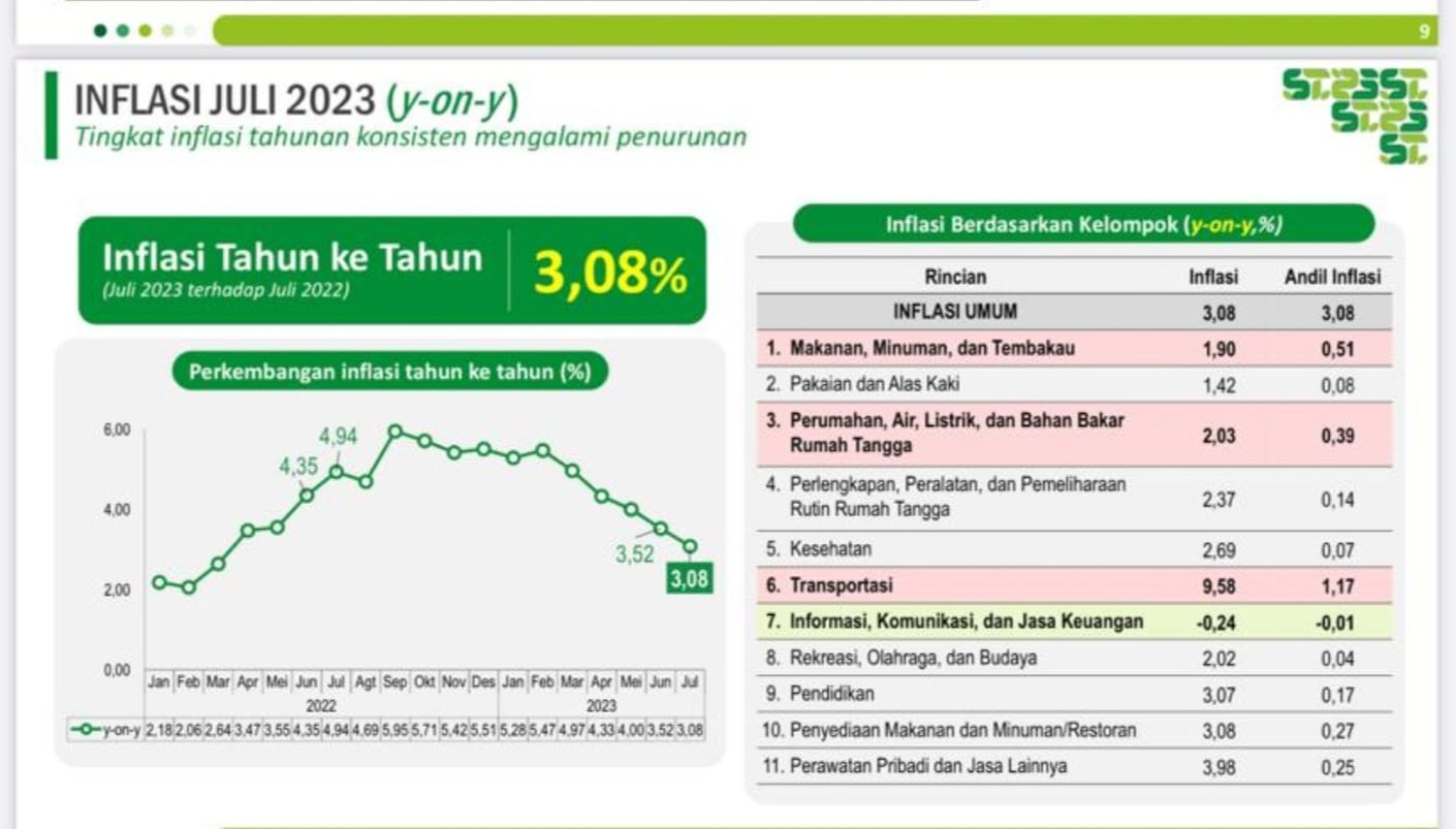 Berdasarkan rilis Badan Pusat Statistik (BPS) yang dipublikasikan Selasa (1/8/2023), capaian inflasi year on year (YoY) pada Juli 2023 sebesar 3,08 persen. Angka ini mengalami penurunan dibanding inflasi YoY bulan Juni 2023 yang sebesar 3,52 persen.