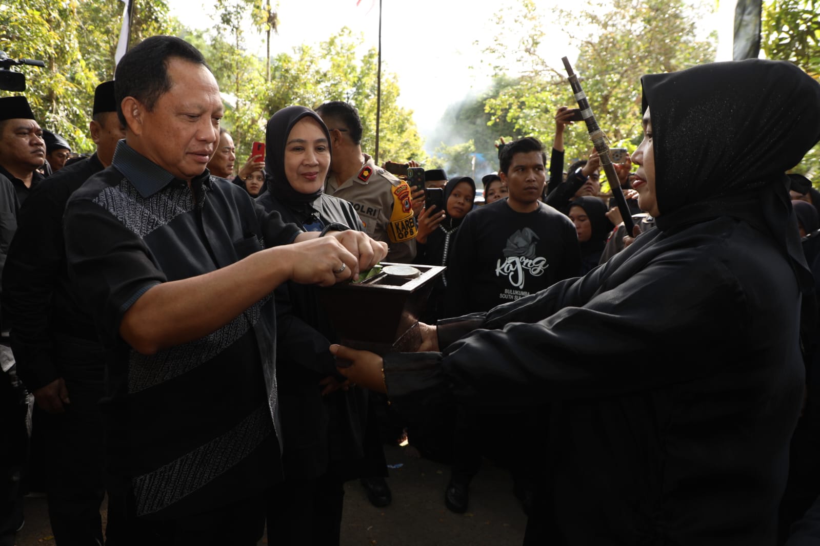 Pada prosesi tersebut, tampak ribuan masyarakat menyambut Mendagri beserta istri. Selain itu, rombongan juga diterima oleh para tokoh dan pemangku adat setempat.