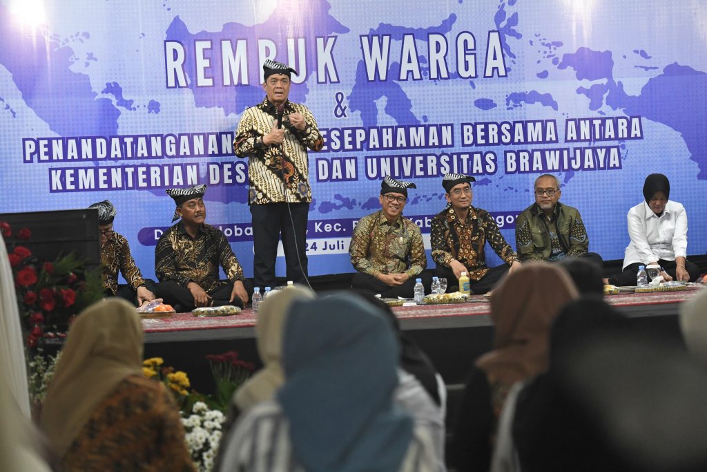 Mendes Yandri didampingi Wamendes Ariza dan Dirjen PDP Nugroho Setijo Nagoro juga menandatangani Memorandum of Understanding (MoU) dengan Rektor Universitas Brawijaya Widodo disaksikan Wakil Bupati Bojonegoro Nurul Azizah, warga, dan peserta Kuliah Kerja Nyata Mahasiswa Membangun Desa (KKN MMD).[Red/Humas]