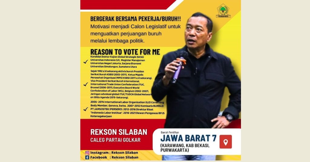 “Sama sekali sebelumnya saya belum masuk partai politik, ini untuk kali pertamanya bergabung di Partai Golkar dan tergerak mencalonkan diri sebagai Caleg. Tadi saya sudah sampaikan misi visi serta latar belakang saya, bahwa sudah saatnya buruh melakukan perubahan kedepan, mereka yang duduk di DPR harus yang memahami perburuhan.” kata Rekson usai menggelar pertemuan dengan perwakilan buruh Kabupaten Bekasi, Kerawang dan Purwakarta di RM Sunda Kabayan Kerawang beberapa hari yang lalu.