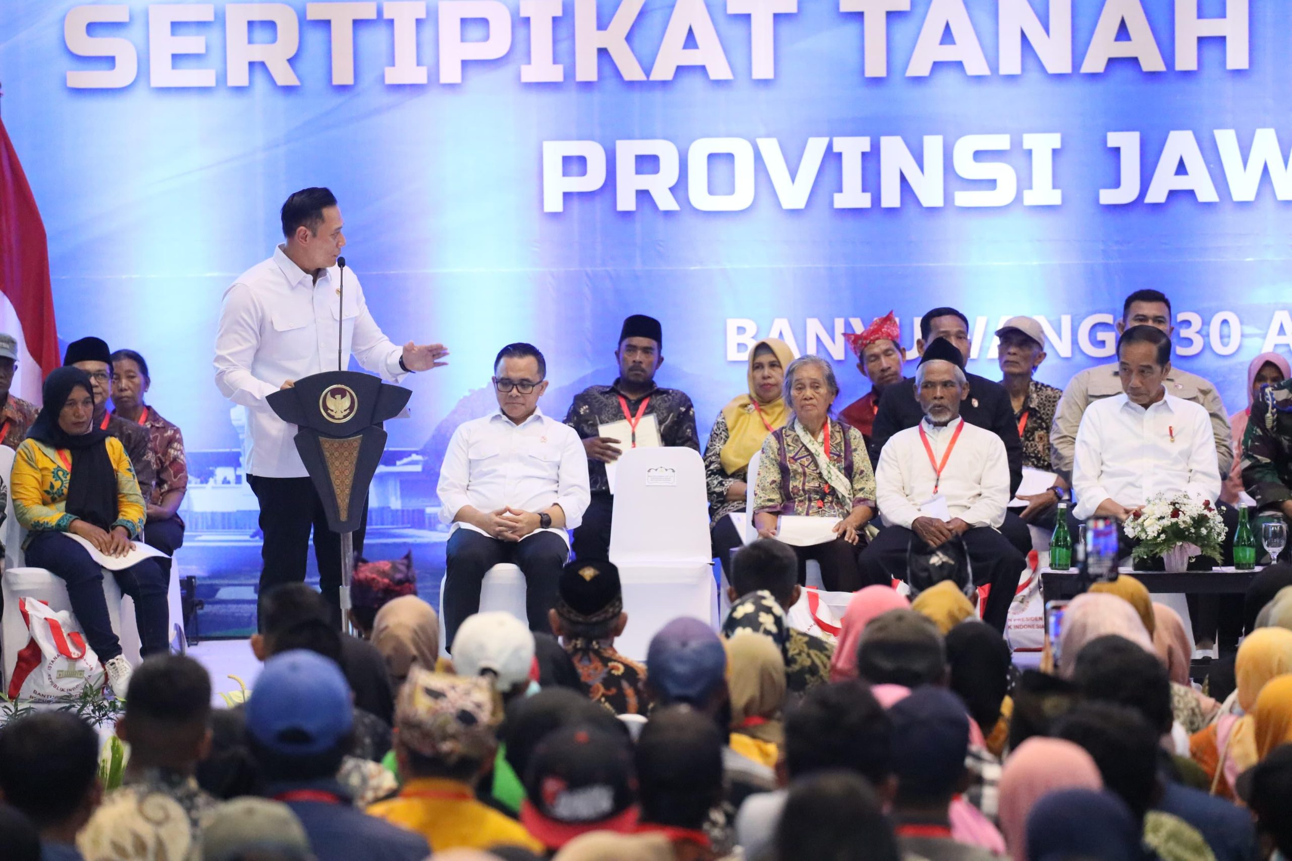 Di hadapan ribuan masyarakat, Presiden Joko Widodo memastikan bahwa sertipikat tanah benar-benar sampai di tangan masyarakat. Pembagian sertipikat hasil Redistribusi Tanah ini adalah yang pertama dilakukan oleh presiden sejak ia menyerahkan SK Biru pada akhir tahun 2023. “Ini adalah Redistribusi Tanah yang paling besar di seluruh Indonesia, di Banyuwangi ini,” terang Presiden RI yang disambut sorak-sorai seluruh masyarakat yang hadir.