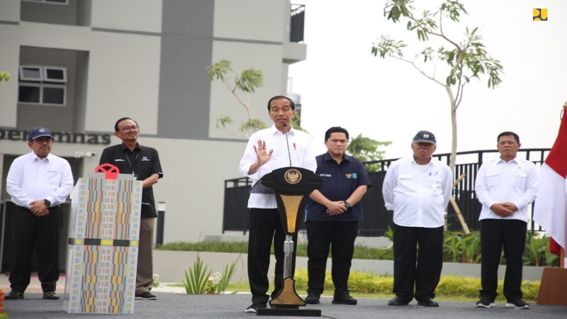 Depok, (DelikAsia.com) | Presiden Joko Widodo (Jokowi) didampingi Menteri Pekerjaan Umum dan Perumahan Rakyat (PUPR) Basuki Hadimuljono bersama Menteri Badan Usaha Milik Negara (BUMN) Erick Thohir meresmikan Rumah Susun (Rusun) Samesta Mahata Margonda, Depok, Kamis (13/4/2023). Rusun ini dibangun konsep Transit Oriented Development (TOD) terintegrasi dengan Stasiun Kereta Pondok Cina.