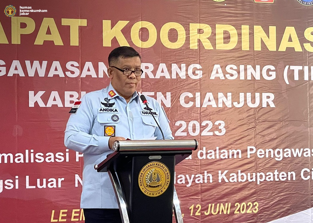 Cianjur, (DelikAsia.com) | Kantor Imigrasi Kelas III Non TPI Cianjur menggelar Rapat Koordinasi Tim Pengawasan Orang Asing (Timpora) di Le Eminence Hotel, Cianjur, pada Senin (12/06/2023). Kegiatan ini bertujuan untuk meningkatkan efektivitas dan sinergi antara anggota Timpora dari berbagai instansi terkait di wilayah Kabupaten Cianjur dalam melaksanakan pengawasan terhadap orang asing yang berada di daerah tersebut.