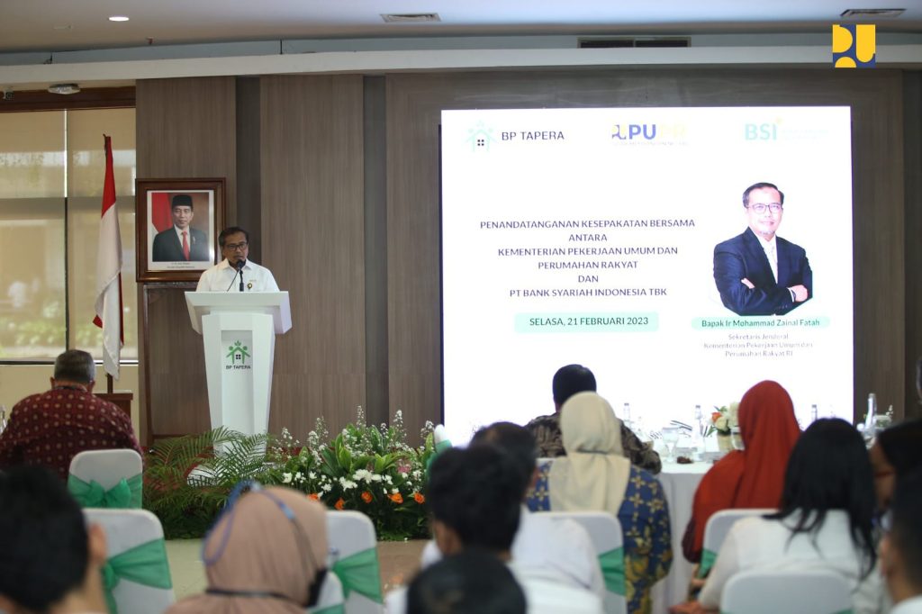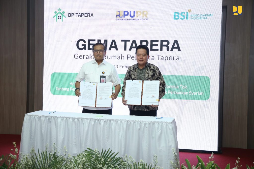 Kerja sama layanan jasa dan produk perbankan syariah ditandai dengan Penandatanganan Kesepakatan Bersama antara Kementerian PUPR yang diwakili oleh Sekretaris Jenderal (Sekjen) Mohammad Zainal Fatah dengan Bank Syariah Indonesia yang diwakili oleh Direktur Utama Hery Gunardi. Acara dilaksanakan bersamaan dengan sosialisasi Gerakan Rumah Pertama Tapera (Gema Tapera) bagi PNS dan CPNS di Kampus PUPR, Selasa (21/2/2023).