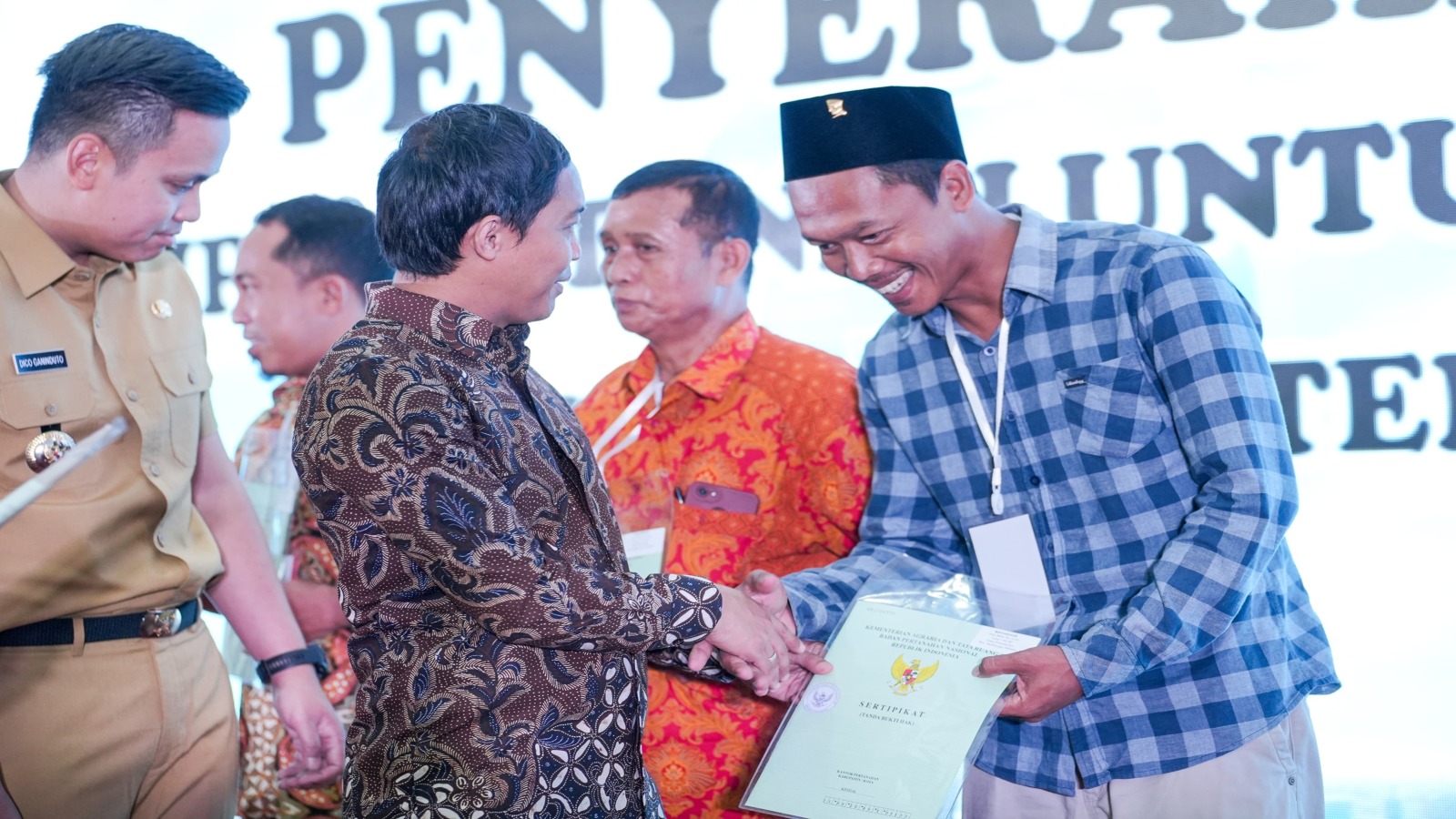 DelikAsia.com, (Kabupaten Kendal) | Rasa haru tergambar di wajah Miftahudin (38) usai menerima sertipikat tanah dari hasil program Pendaftaran Tanah Sistematis Lengkap (PTSL), pada Senin (18/12/2023). Apalagi ia menerima sertipikat itu langsung dari Wakil Menteri Agraria dan Tata Ruang/Wakil Kepala Badan Pertanahan Nasional (Wamen ATR/Waka BPN), Raja Juli Antoni.