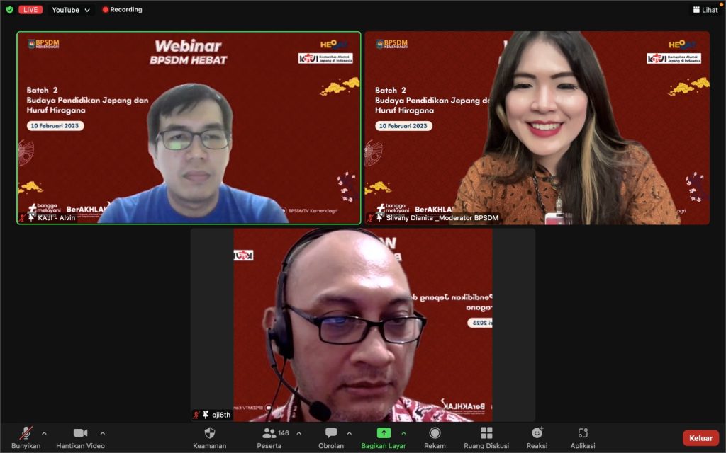 Sementara itu, Alvin memaparkan bahwa hiragana adalah huruf yang pertama kali dikenal oleh anak SD dalam menulis dan menjadi dasar bagi penulisan huruf lain seperti Katakagana dan Kanji. Dia berharap, pemahaman tentang budaya dan bahasa Jepang dapat diimplementasikan secara nyata di masa depan dan peserta tidak bosan untuk belajar.