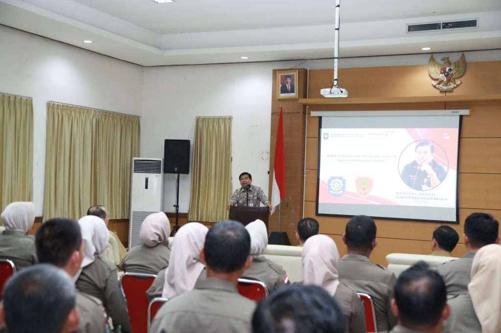 Bogor, (DelikAsia.com) | Sekretaris Jenderal (Sekjen) Kementerian Dalam Negeri (Kemendagri) Suhajar Diantoro mendorong jajaran Satuan Polisi Pamong Praja (Satpol PP) agar lebih humanis dalam menjalankan tugas dan fungsinya. Salah satu tugas tersebut yakni menegakkan peraturan daerah (Perda) dan peraturan kepala daerah (Perkada).