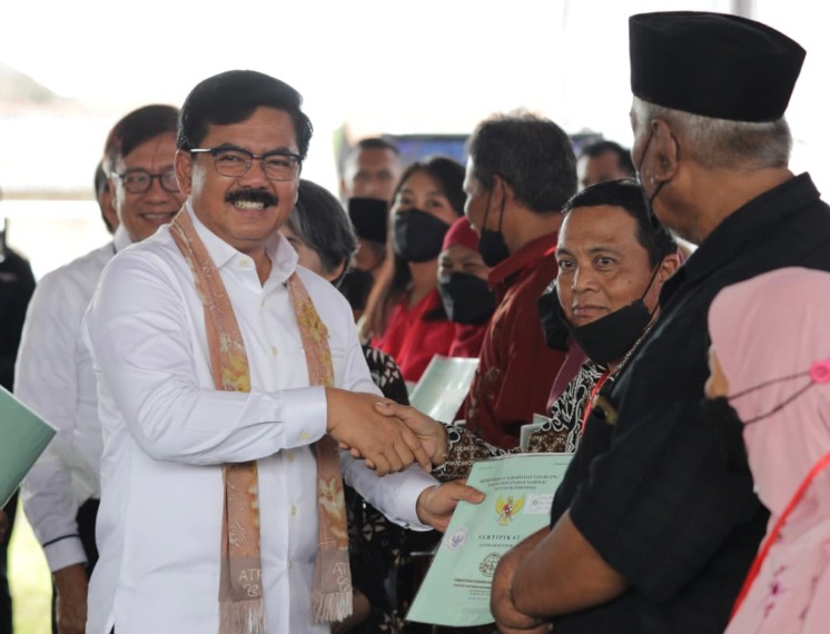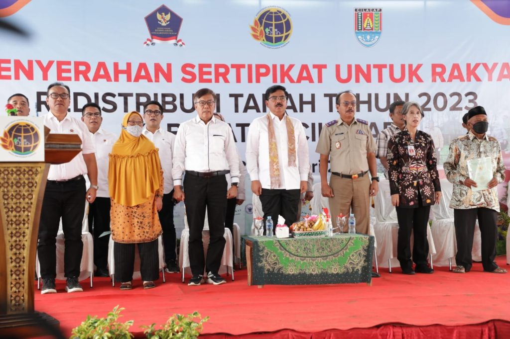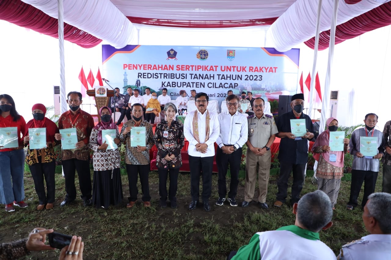 Cilacap, (DelikAsia.com) | Menteri Agraria dan Tata Ruang/Kepala Badan Pertanahan Nasional (ATR/BPN), Hadi Tjahjanto menyerahkan sertipikat hasil program Redistribusi Tanah di Kabupaten Cilacap, bertempat di Desa Donan, pada Jumat (03/02/2023). Sertipikat Redistribusi Tanah yang diserahkan kali ini sejumlah 288 dan disampaikan langsung oleh Menteri ATR/Kepala BPN kepada 12 orang perwakilan masyarakat Cilacap.