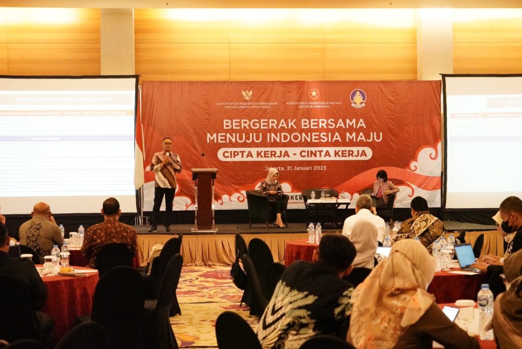 Hal itu menjadi topik utama yang diulas dalam Forum Tematik Bakohumas bertajuk “Bergerak Bersama Menuju Indonesia Maju Cipta Kerja Cinta Kerja” di Hotel JS Luwansa, Kuningan, Jakarta Selatan, Selasa (31/1/2023). Kegiatan tersebut difasilitasi oleh Kementerian Sekretariat Negara (Kemensetneg) dan dihadiri oleh pejabat dan pelaksana kehumasan dari seluruh kementerian/lembaga.