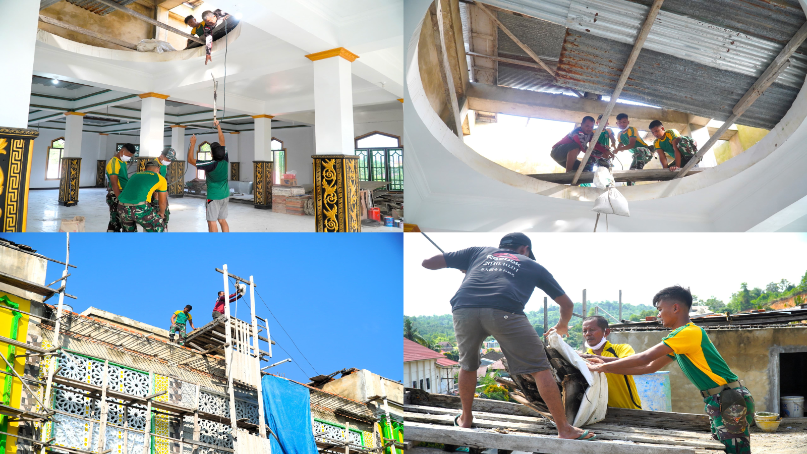 Anggota Satgas Pamtas Yonarmed 11 Kostrad bersama masyarakat setempat bergotong royong dalam pelaksanaan perbaikan Masjid Darul Falah. Kegiatan ini berlangsung dengan semangat kebersamaan, di mana anggota TNI dan warga mengerjakan berbagai bagian bangunan masjid yang masih memerlukan sentuhan.
