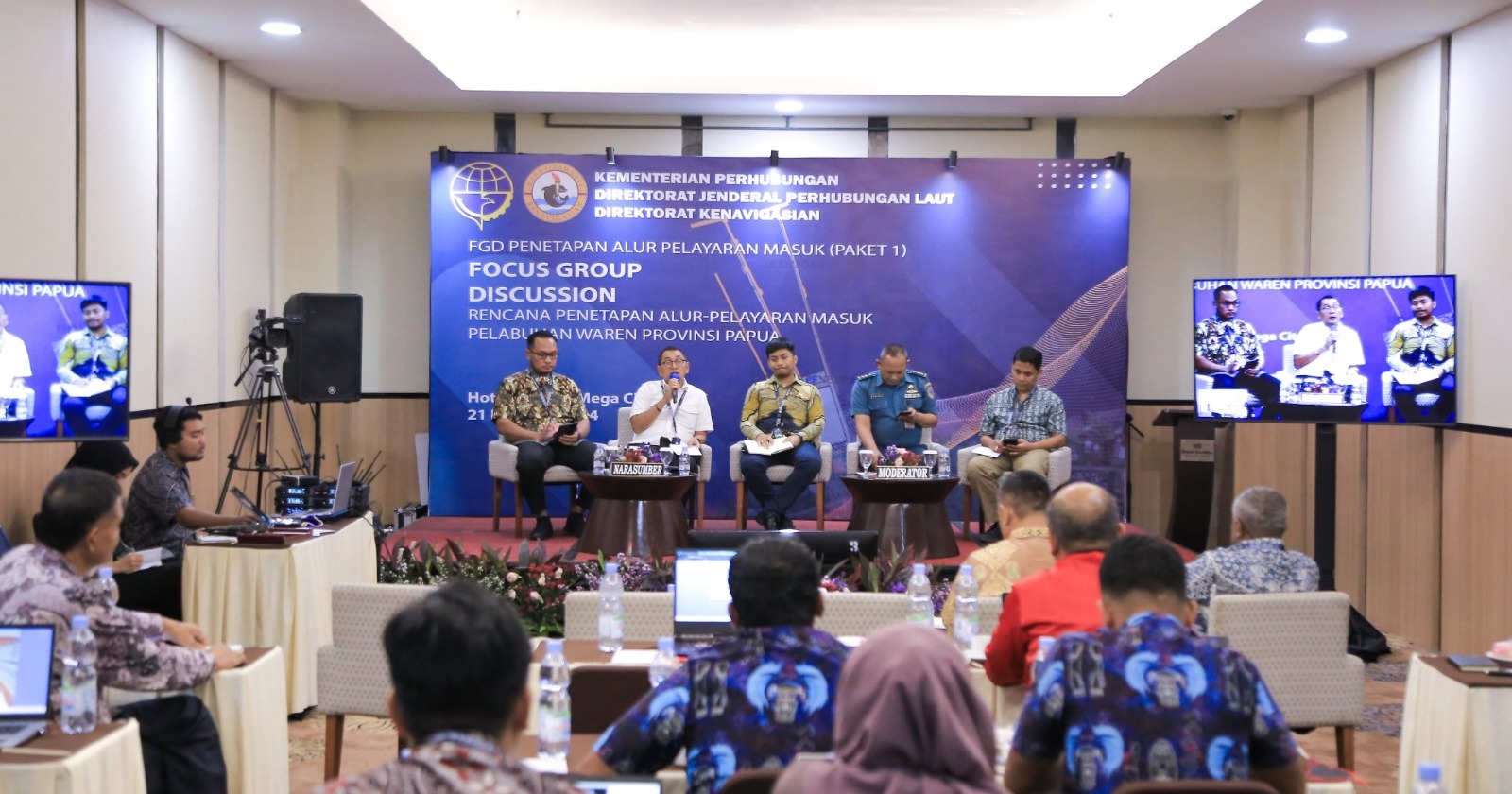Adapun FGD kali ini menghadirkan para narasumber dari Distrik Navigasi Tipe A Kelas II Jayapura membahas Survey hidro-oceanografi dalam rangka rencana penetapan alur-pelayaran masuk Pelabuhan Waren, Direktorat Kepelabuhanan membahas dukungan data dan informasi rencana pengembangan Pelabuhan Waren, Pushidrosal membahas pentingnya penggambaran alur-pelayaran masuk Pelabuhan Waren pada Peta Laut Indonesia, dan Direktorat Kenavigasian membahas proses penetapan alur-pelayaran masuk Pelabuhan Waren.