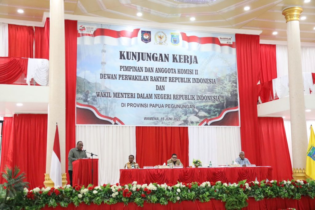 Harapan tersebut disampaikan Wempi pada sesi diskusi Kunjungan Kerja Pimpinan dan Anggota Komisi II DPR RI dan Wakil Menteri Dalam Negeri di Provinsi Papua Pegunungan yang berlangsung di Gedung Aithosa, Wamena, Jayawijaya, Kamis (15/6/2023). Acara ini diikuti jajaran kepala daerah se-Provinsi Papua Pegunungan, Forum Koordinasi Pimpinan Daerah (Forkopimda), dan sejumlah tokoh masyarakat.