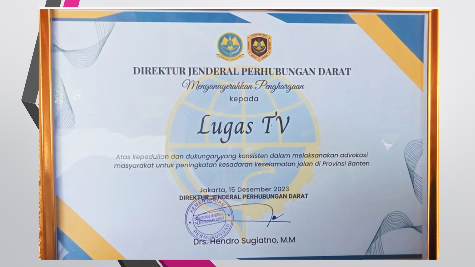 Balai Pengelola Transportasi Darat (BPTD) kelas II Banten melalui direktorat jenderal perhubungan darat dari kementerian Perhubungan RI meanugrahkan penghargaan kepada Lugas TV “Atas Kepedulian dan Dukungan Yang Konsisten Dalam Melaksanakan Advokasi Masyarakat Untuk Peningkatan Kesadaran Keselamatan Jalan di Provinsi Banten”.[RED].