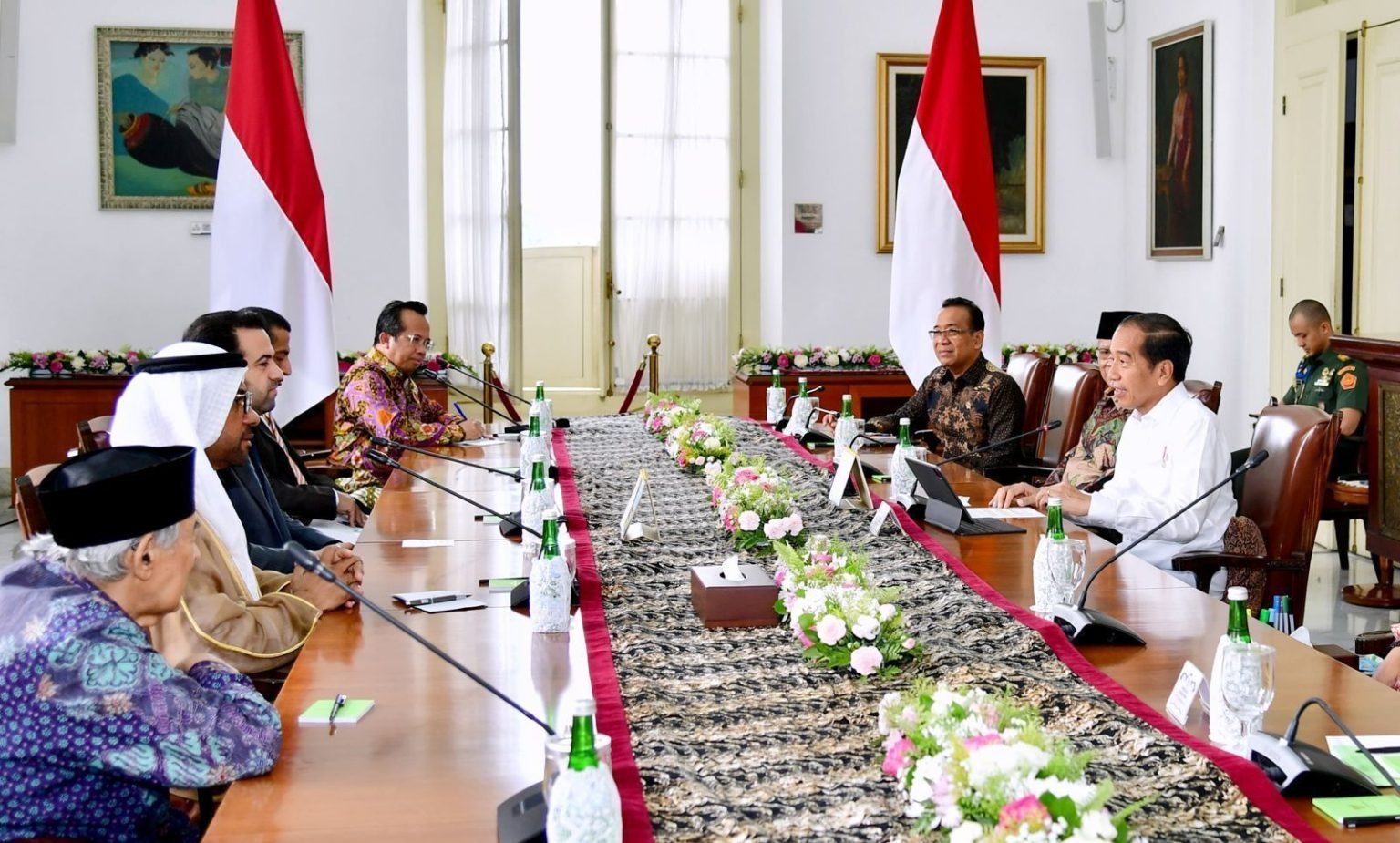 Turut mendampingi Presiden dalam pertemuan tersebut adalah Menteri Sekretaris Negara Pratikno, Menteri Agama Yaqut Cholil Qoumas, Ketua Umum PBNU Yahya Cholil Staquf, Sekjen PBNU Syaifullah Yusuf, Ketua Umum PP Muhammadiyah Haedar Nasir, dan Sekjen PP Muhammadiyah Abdul Mu’ti.