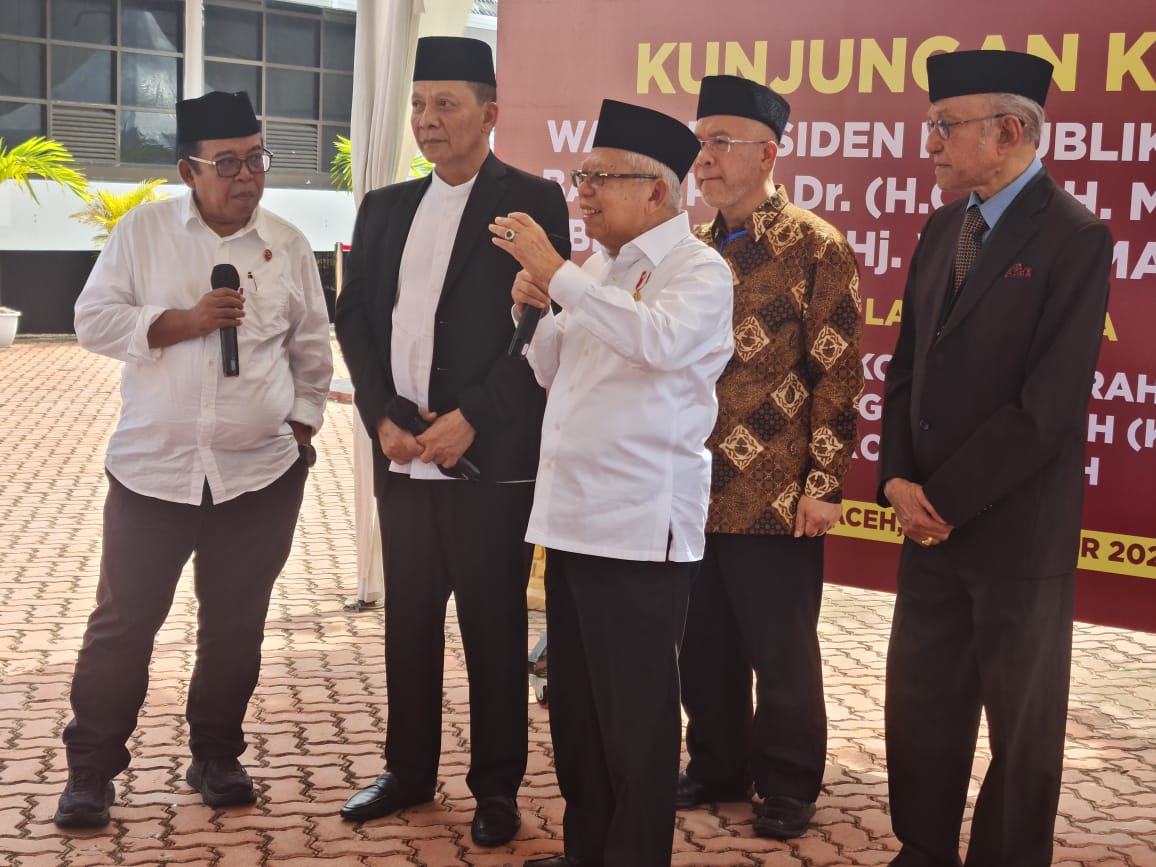 Mendampingi Wapres pada konferensi pers kali ini, Pj. Gubernur Aceh Achmad Marzuki, Wali Nanggroe Aceh Teungku Malik Mahmud Al Haythar, Plt. Direktur Eksekutif KNEKS Taufik Hidayat, serta Staf Khusus Wapres Bidang Komunikasi dan Informasi Masduki Baidlowi.[EP/SK-BPMI, Setwapres]