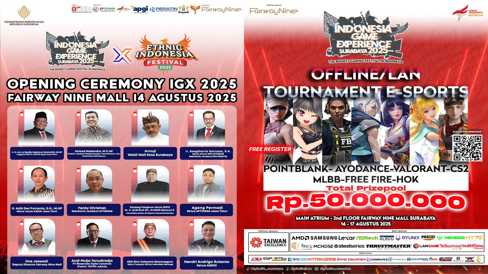 Kegiatan tersebut akan dibuka secara resmi pada hari Kamis, 14 Agustus 2025 Pukul 10.00 WIB di Main Atrium, Lantai 2 – Fairway Nine Mall, Surabaya oleh deretan tokoh kunci dari pemerintah, industri, dan budaya antara lain;
