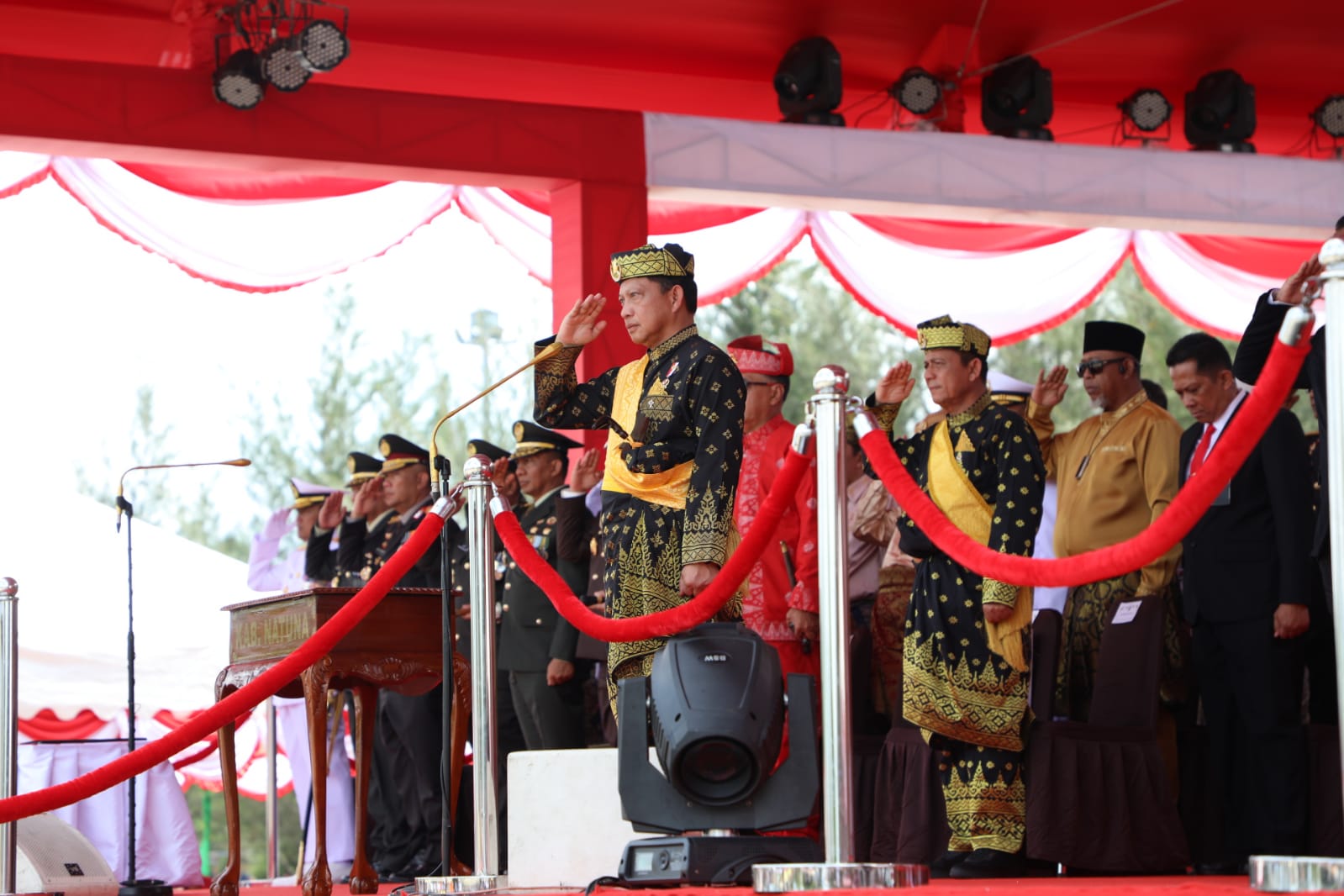 Ranai, (DelikAsia.com) | Menteri Dalam Negeri (Mendagri) Muhammad Tito Karnavian menjadi Inspektur Upacara Peringatan Hari Ulang Tahun (HUT) Ke-78 Kemerdekaan Republik Indonesia, di Pantai Piwang, Kabupaten Natuna, Kepulauan Riau (Kepri), Kamis (17/8/2023). Dalam kesempatan itu, Mendagri mengenakan pakaian kebesaran adat Melayu dengan nuansa warna hitam dan kuning keemasan. Pakaian adat serupa juga turut dikenakan oleh Istri Mendagri, Tri Tito Karnavian, yang hadir mendampingi.