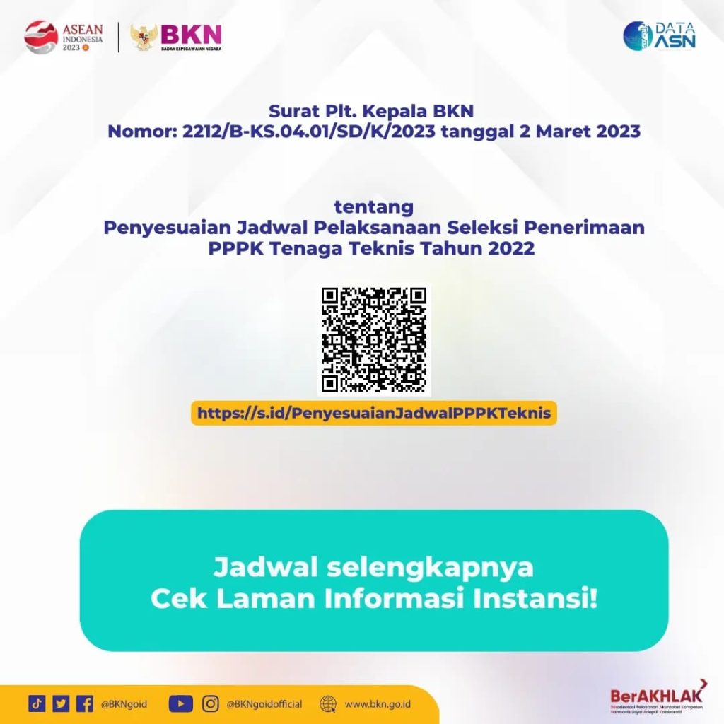 Jakarta, (DelikAsia.com) | Pelaksanaan seleksi kompetensi Pegawai Pemerintah dengan Perjanjian Kerja (PPPK) untuk Tenaga Teknis Tahun 2022 akan dimulai pada Jumat, 17 Maret 2023 dengan menggunakan seleksi berbasis Computer Asissted Test (CAT). Badan Kepegawaian Negara (BKN) bersama Panitia Seleksi masing-masing Instansi tengah menyiapkan rangkaian penyelenggaraan seleksi, seperti penjadwalan ujian dan sebaran titik lokasi yang akan digunakan.