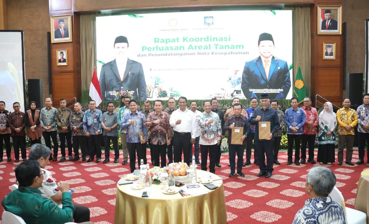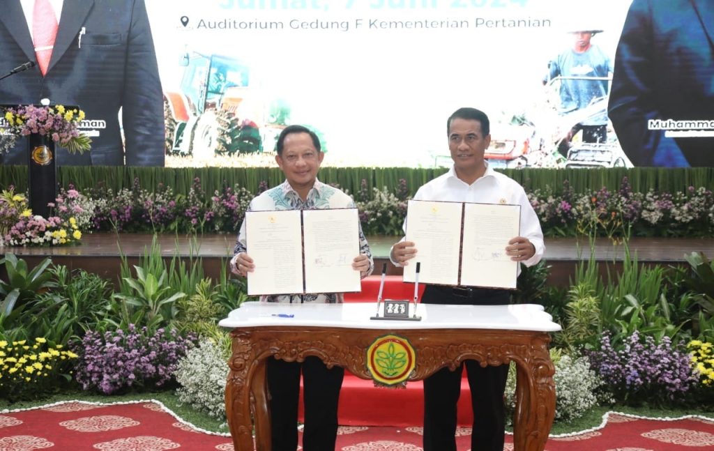 DelikAsia.com, (Jakarta) | Wujudkan swasembada pangan, Kementerian Dalam Negeri (Kemendagri) bersama Kementerian Pertanian (Kementan) menandatangani Memorandum of Understanding (MoU) atau Nota Kesepahaman mengenai progam cetak sawah rakyat. Kegiatan yang dirangkaikan dengan Rapat Koordinasi (Rakor) Perluasan Areal Tanam ini berlangsung di Auditorium Gedung F Kantor Pusat Kementan, Jakarta, Jumat (7/6/2024).