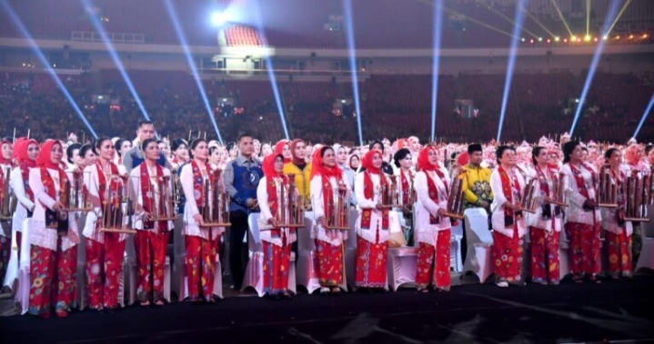Sebanyak 15 ribuan orang memainkan angklung dalam upaya pemecahan rekor tersebut, termasuk Ibu Iriana Joko Widodo dan Ibu Wury Ma’ruf Amin.