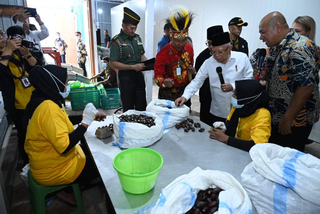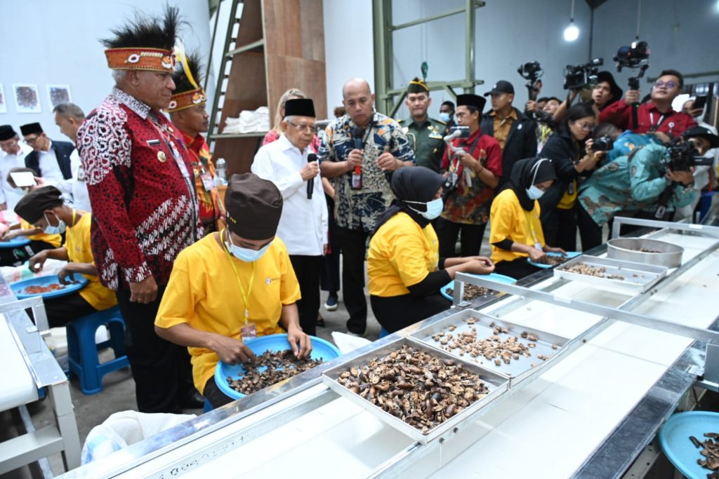 Selanjutnya Wapres berkeliling melihat secara langsung proses produksi pengolahan pala tomandin yang sedang dilakukan oleh para pekerja, hingga hasil akhir dari pengolahan kekayaan rempah yang tumbuh dan menjadi kebanggaan masyarakat Fakfak ini.