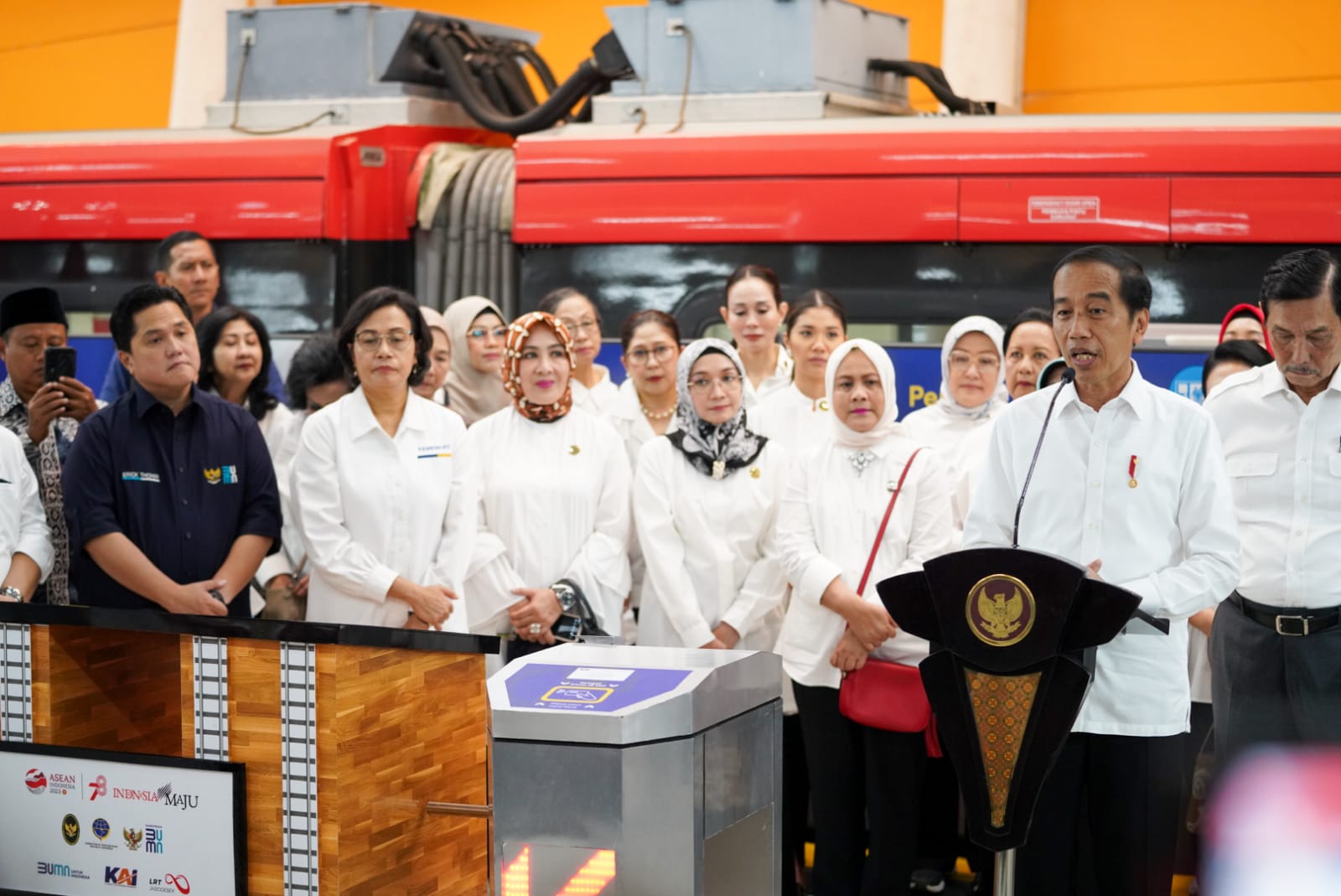 Peresmian LRT Jabodebek tersebut dihadiri oleh Ibu Negara Republik Indonesia, Iriana Joko Widodo, Ibu Wakil Negara Republik Indonesia Wury Ma’ruf Amin, beserta jajaran Menteri Kabinet Indonesia Maju, seperti Menteri Koordinator Bidang Kemaritiman dan Investasi Luhut Binsar Pandjaitan, Menteri Perhubungan Budi Karya Sumadi, Menteri BUMN Erick Thohir, Menteri Pekerjaan Umum dan Perumahan Rakyat Basuki Hadimuljono, Menteri Keuangan Sri Mulyani, Ibu-Ibu OASE Kabinet Indonesia Maju, serta PJ Gubernur DKI Jakarta Heru Budi Hartono, dan Direktur Utama PT KAI (Persero) Didiek Hartantyo dan jajaran stakeholders lainnya.