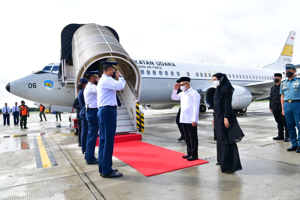 Menggunakan pesawat Kepresidenan Boeing 737-400 TNI AU, Wapres dan Ibu Hj. Wury Ma’ruf Amin dan rombongan lepas landas dari Pangkalan Udara TNI AU Halim Perdanakusuma menuju Pangkalan Udara TNI AU Sultan Hasanuddin pada pukul 09.00 WIB/10.00 WITA.