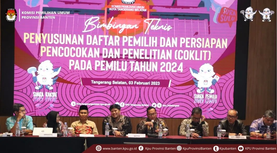 KPU Banten, (DelikAsia.com) | Hari ini 2023, Ketua KPU Provinsi Banten, Anggota KPU Divisi Data dan Informasi, Sekretaris KPU Provinsi Banten beserta Operator Sidalih menghadiri Kegiatan Bimtek Penyusunan Daftar Pemilih dan Persiapan Pencocokan dan Penelitian (Coklit) Pada Pemilu Tahun 2024 yang diadakan oleh KPU Kota Tangerang Selatan bertempat di Hotel Trembesi Tangerang (3/2).