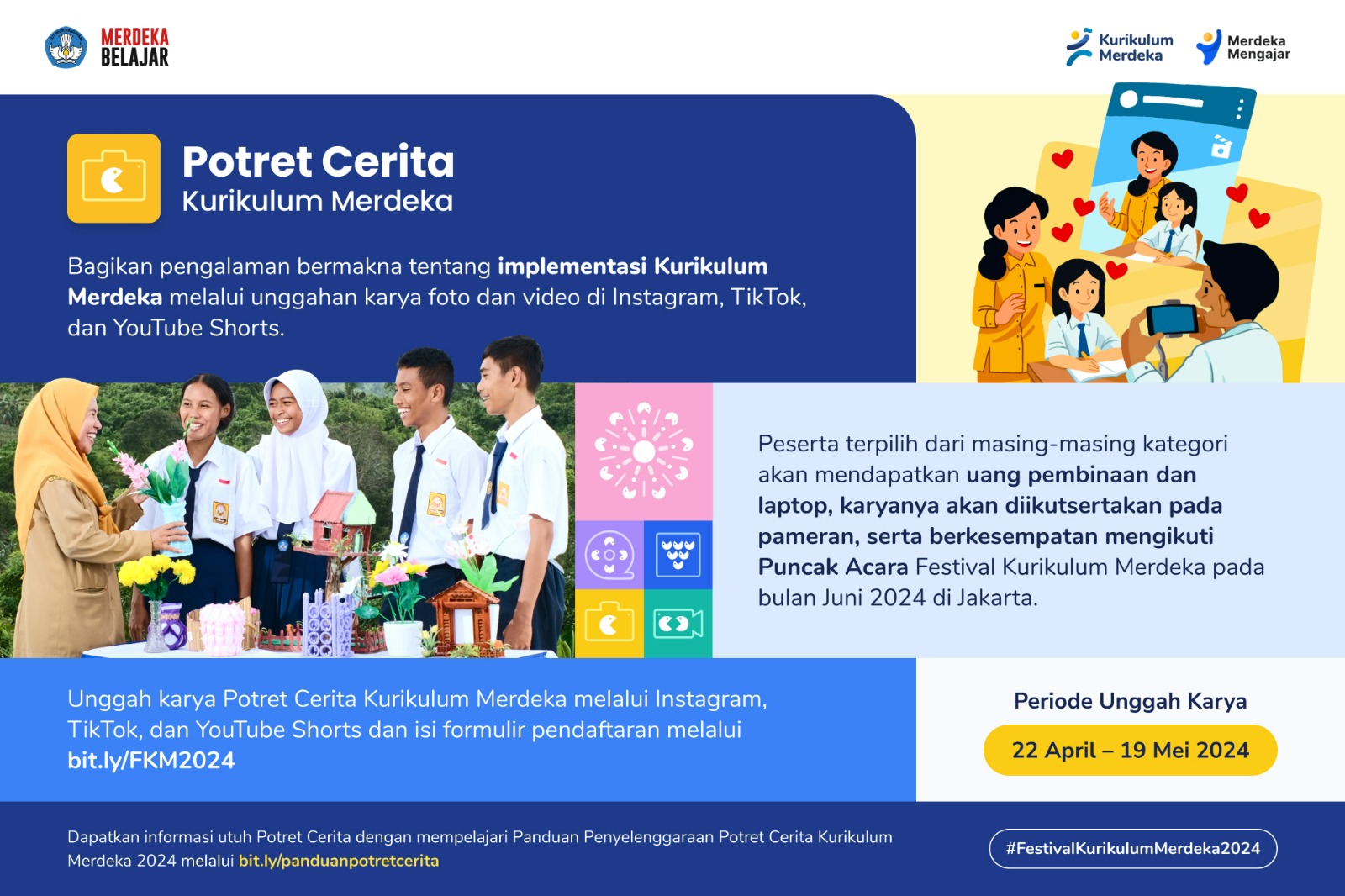 DelikAsia.com, (Jakarta) | Kementerian Pendidikan, Kebudayaan, Riset, dan Teknologi (Kemendikbudristek) kembali menyelenggarakan Potret Cerita Kurikulum Merdeka dalam rangka memeriahkan Festival Kurikulum Merdeka (FKM) tahun 2024. Sebagaimana tahun sebelumnya, aktivitas ini menjadi ruang berbagi dan belajar praktik baik yang otentik dari implementasi Kurikulum Merdeka dalam bentuk foto dan video yang disampaikan oleh peserta didik, pendidik dan tenaga kependidikan, serta orang tua peserta didik melalui akun media sosial mereka masing-masing.
