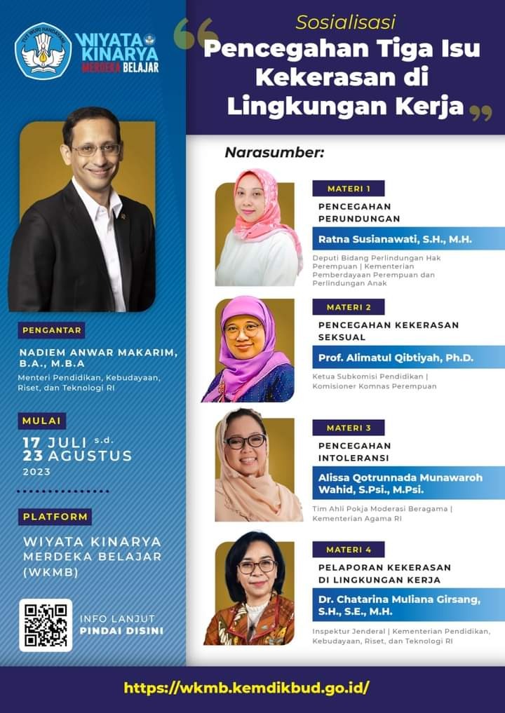 Jakarta, (DelikAsia.com) | Kementerian Pendidikan, Kebudayaan, Riset, dan Teknologi (Kemendikbudristek) menggelar sosialisasi pencegahan tiga isu kekerasan di lingkungan kerja kepada seluruh pegawai Aparatur Sipil Negara (ASN). Sebanyak 120.850 pegawai di lingkungan Kemendikbudristek yang dibagi ke dalam 26 sesi ini akan mengikuti sosialisasi secara daring melalui Wiyata Kinarya Merdeka Belajar (WKMB).