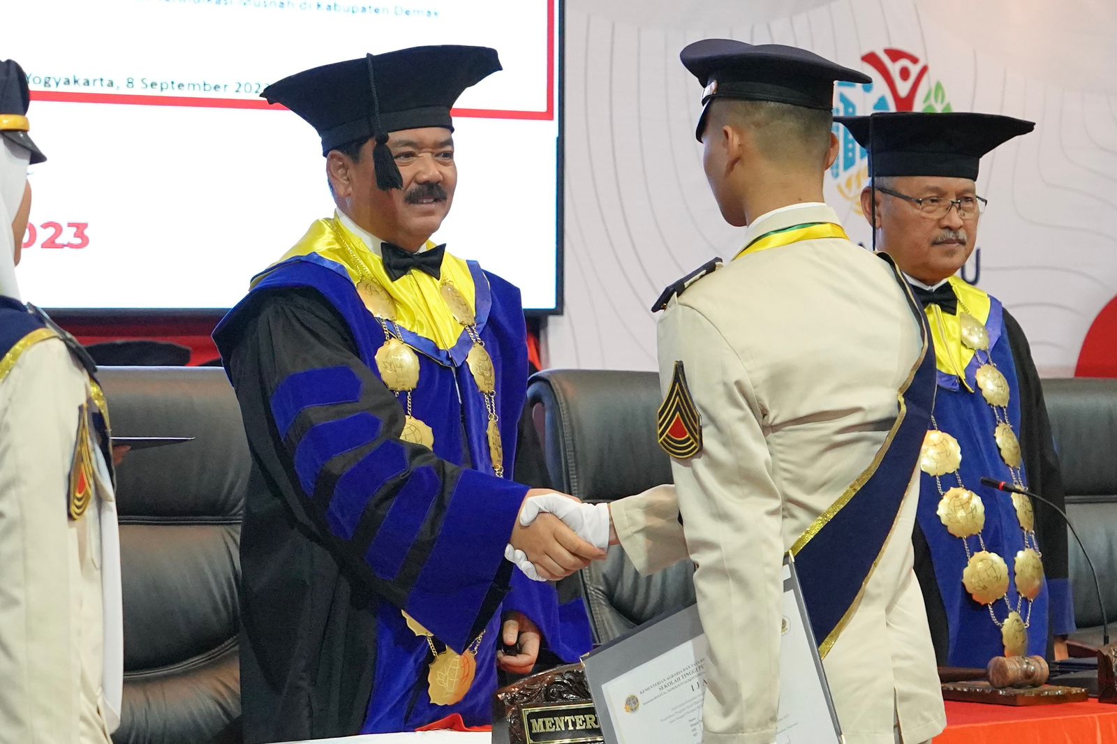 Sleman, (DelikAsia.com) | Menteri Agraria dan Tata Ruang/Kepala Badan Pertanahan Nasional (ATR/BPN), Hadi Tjahjanto mengikuti Sidang Terbuka Senat Sekolah Tinggi Pertanahan Nasional (STPN) dengan acara tunggal Wisuda Program Diploma IV Pertanahan serta Program Diploma I Pengukuran dan Pemetaan Kadastral Tahun Akademik 2022/2023. Kegiatan berlangsung di Pendopo STPN, Kabupaten Sleman, Provinsi D.I. Yogyakarta, pada Jumat (08/09/2023).