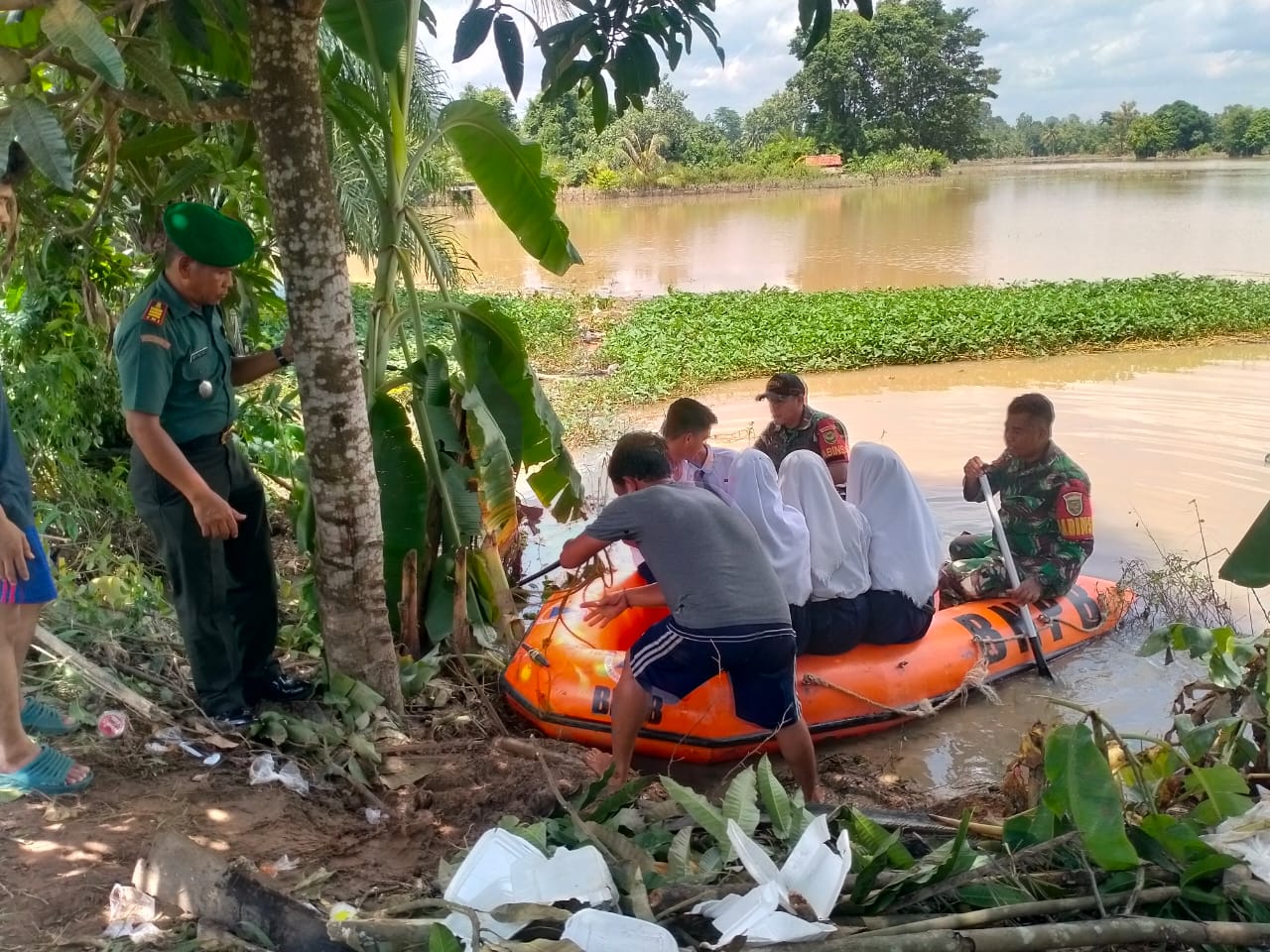 Jembatan yang menghubungkan sejumlah sekolah mengalami kerusakan serius, memaksa mereka untuk mencari alternatif lain. Babinsa setempat dengan sigap mengambil inisiatif menggunakan perahu karet untuk solusi sementara.
