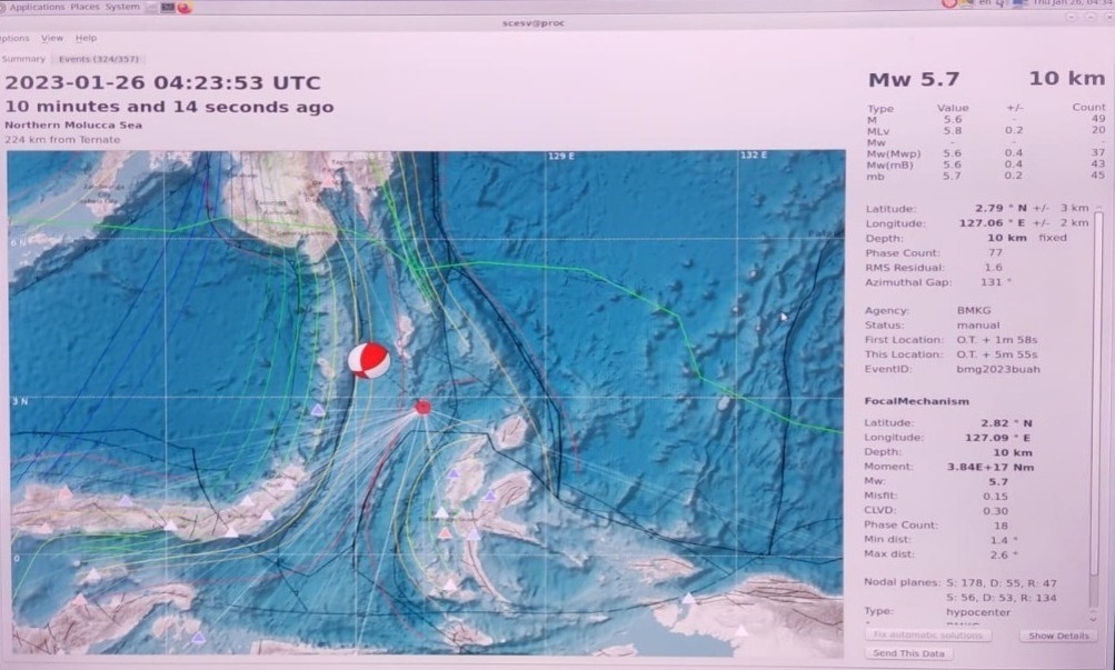 DelikAsia.com, (Jakarta),–Pada Hari Kamis 26 Januari 2023 pukul 11.23.52 WIB wilayah Laut Maluku diguncang gempa tektonik. Hasil analisis BMKG menunjukkan gempabumi ini memiliki parameter update dengan magnitudo M5,7. Episenter gempabumi terletak pada koordinat 2,79° LU ; 127,06° BT, atau tepatnya berlokasi di laut pada jarak 140 Km arah Tenggara Kota Melonguane, Sulawesi Utara pada kedalaman 10 km.