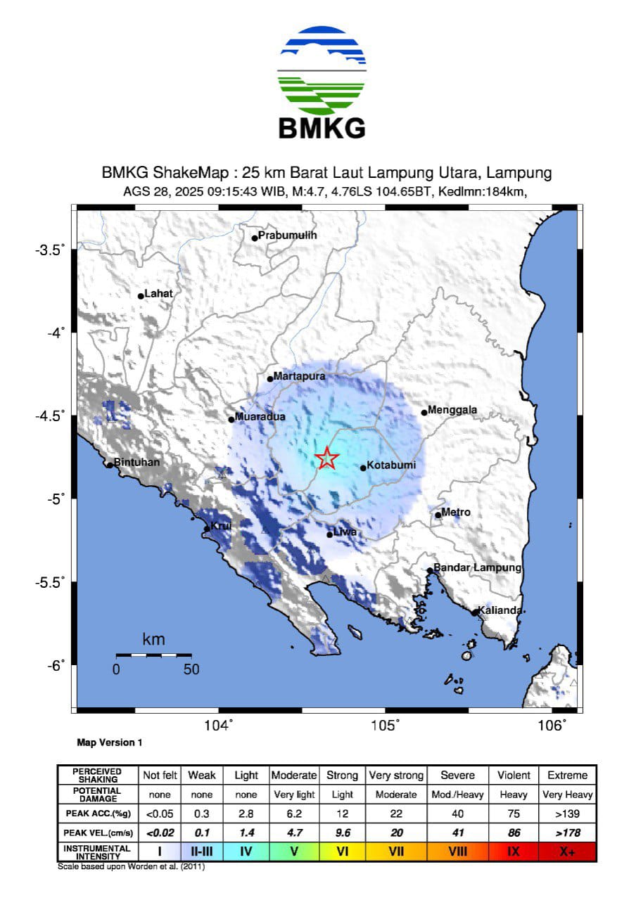 Sementara di wilayah Kota Agung, gempa dirasakan dengan intensitas II–III MMI, yang menunjukkan getaran ringan namun tetap terasa oleh sebagian warga.