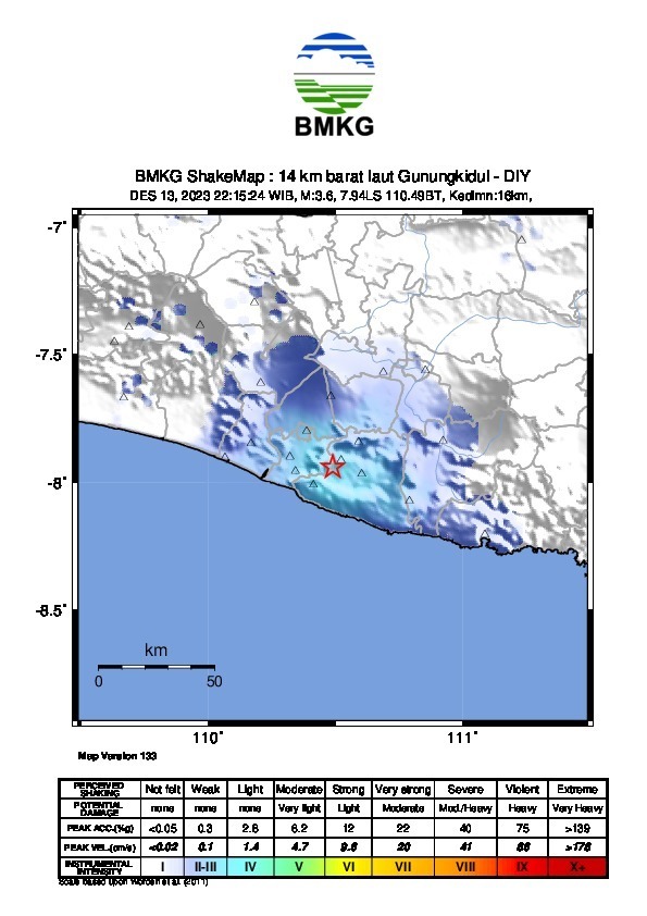 DelikAsia.com, (Jakarta) | Dari Sumber hasil monitoring BMKG Kejadian dan Parameter Gempabumi: Hari Rabu, 13 Desember 2023 pukul 22:15:24 WIB wilayah DIY dan sekitarnya diguncang gempabumi tektonik. Hasil analisis BMKG menunjukkan gempabumi ini memiliki parameter dengan magnitudo M3,6. Episenter gempabumi terletak pada koordinat 7.94° LS; 110.49° BT tepatnya di darat pada jarak 14 km arah Baratlaut Gunungkidul dengan kedalaman 16 Km.