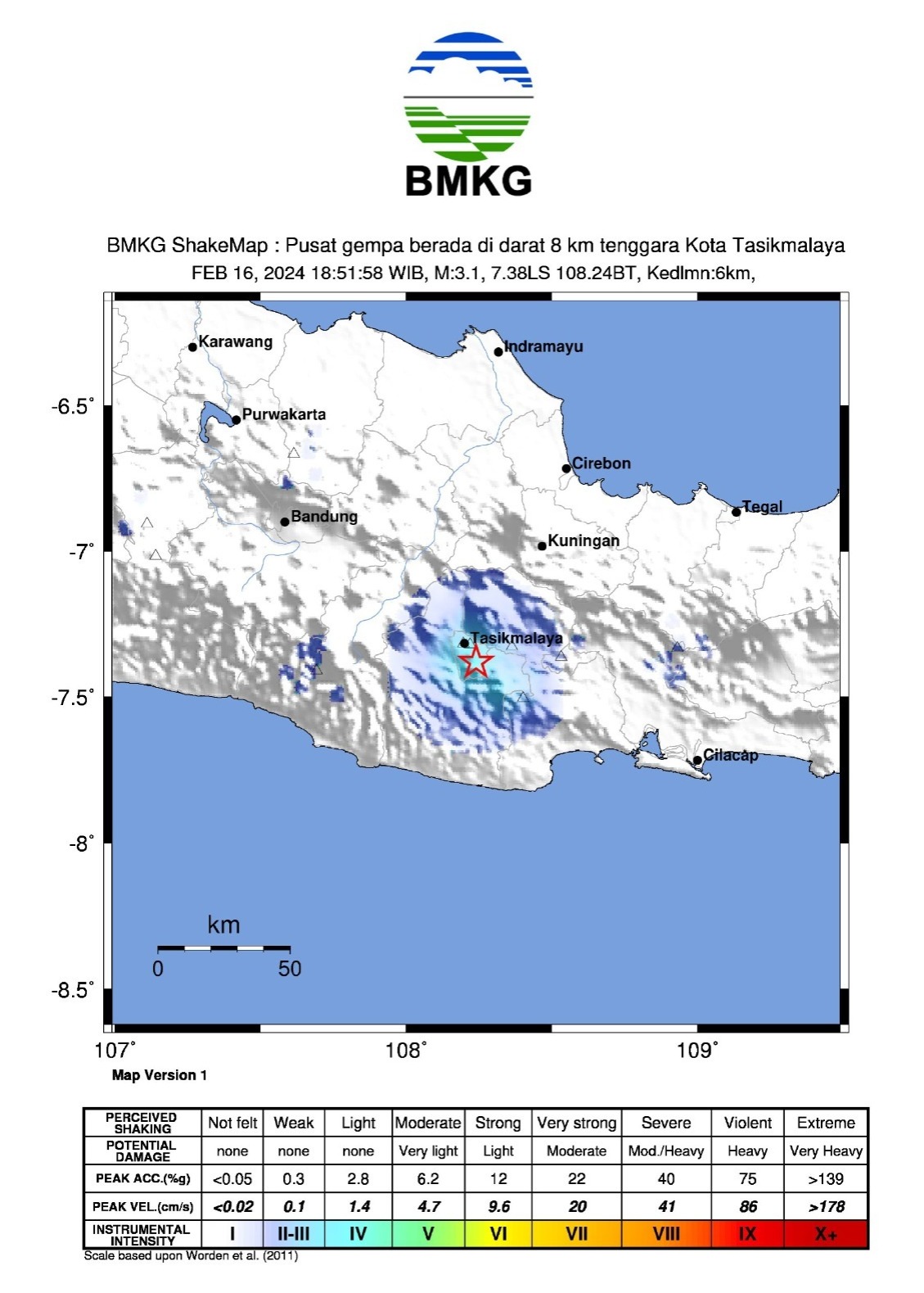 DelikAsia.com, (Tasikmalaya) | Dari Sumber BMKG pada Hari Jumat, 16 Februari 2024 pukul 18:51:58 WIB, wilayah Kota Tasikmalaya, Jawa Barat dan sekitarnya telah diguncang gempabumi tektonik.