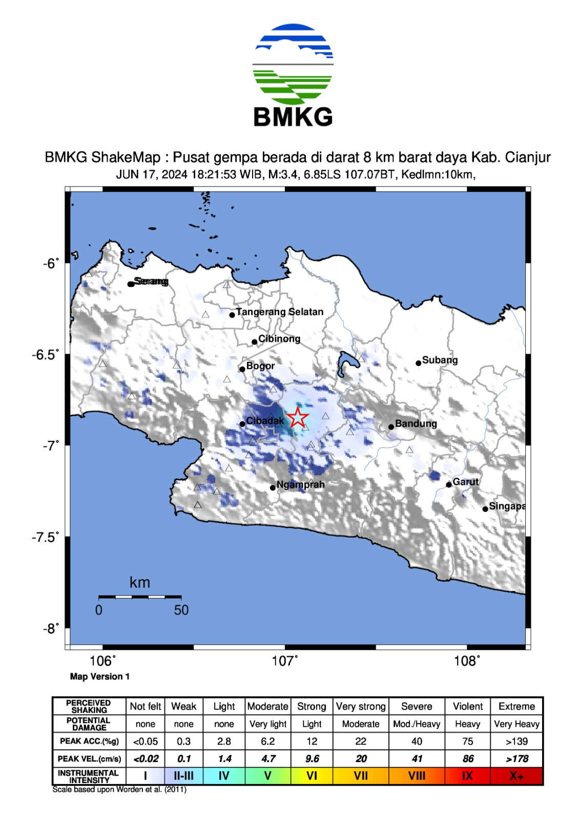 DelikAsia.com, (Jakarta) |  Kejadian dan Parameter Gempabumi pada hari senin, 17 Juni 2024 pukul 18:21:53 WIB, wilayah KAB-CIANJUR-JABAR dan sekitarnya diguncang gempabumi tektonik. Hasil analisa BMKG menunjukkan bahwa gempabumi ini berkekuatan M=3,4. Episenter terletak pada koordinat 6.85 LS dan 107.07 BT, atau tepatnya berlokasi di darat pada jarak 8 km BaratDaya KAB-CIANJUR-JABAR pada kedalaman 10 km.