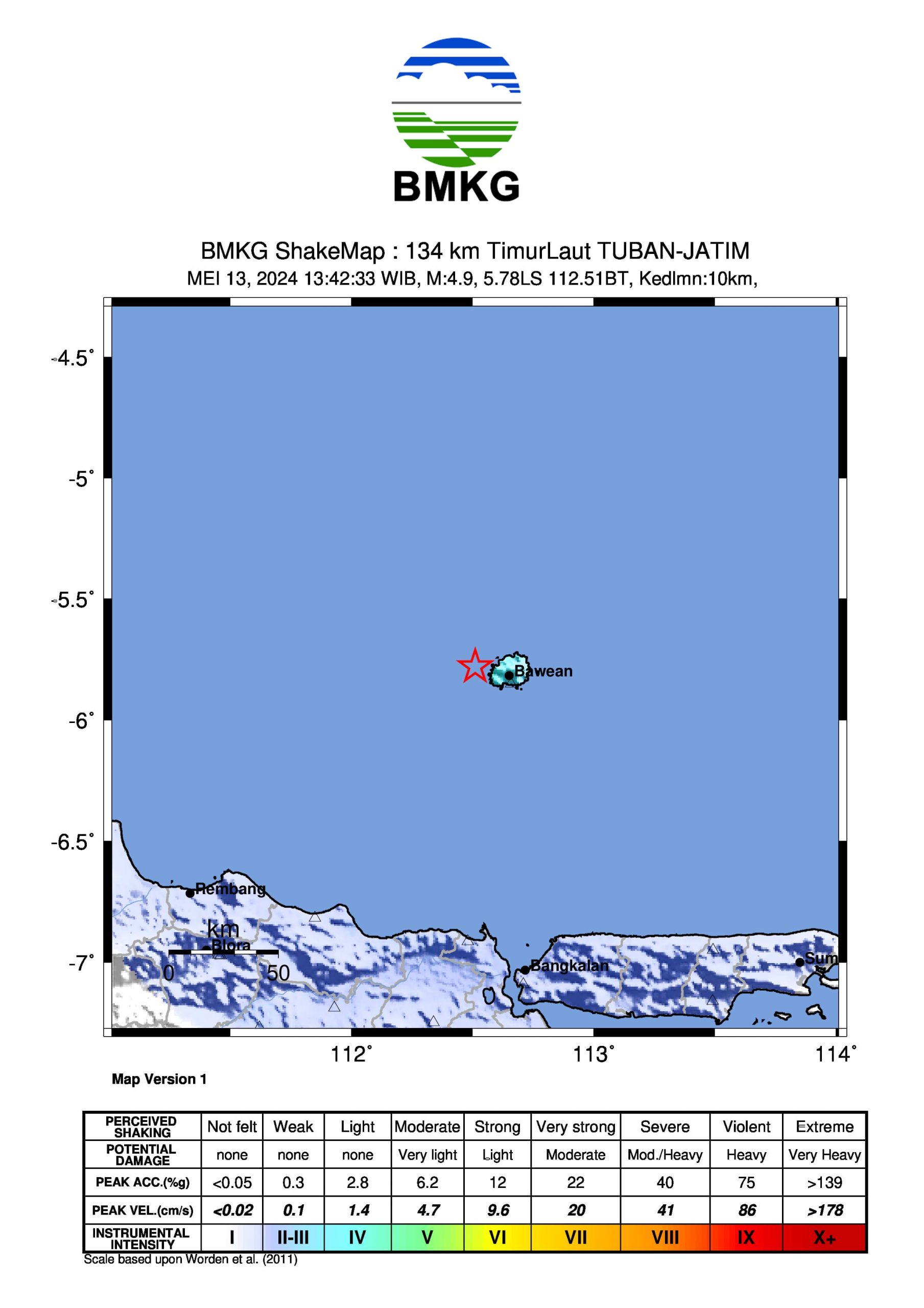 DelikAsia.com, (Jakarta) | Kejadian dan Parameter Gempabumi, Hari Senin, 13 Mei 2024 pukul 13:42:33 WIB wilayah Bawean, JATIM dan sekitarnya diguncang gempabumi tektonik. Hasil analisis BMKG menunjukkan gempabumi ini memiliki parameter dengan magnitudo M4,9. Episenter gempabumi terletak pada koordinat 5.78° LS; 112.51° BT tepatnya di laut pada jarak 134 km arah Timur Laut Tuban, JATIM dengan kedalaman 10 Km.