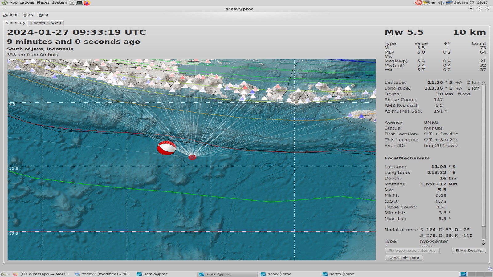 DelikAsia.com, (Jakarta) |  Pada Hari Sabtu 27 Januari 2024 pukul 16.33.17 WIB wilayah Samudera Hindia Selatan Jawa, Jember, Jawa Timur diguncang gempa tektonik. Hasil analisis BMKG menunjukkan gempabumi ini memiliki parameter update dengan magnitudo M5,5. Episenter gempabumi terletak pada koordinat 11,56° LS ; 113,36° BT, atau tepatnya berlokasi di laut pada jarak 370 Km arah Barat Daya Kuta Selatan, Bali pada kedalaman 10 km.