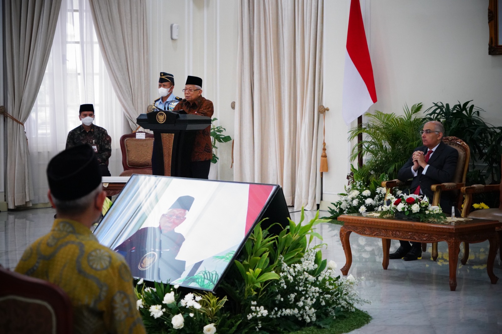 Sementara, Wapres didampingi oleh Kepala Sekretariat Wapres Ahmad Erani Yustika, Deputi Bidang Dukungan Kebijakan Ekonomi dan Peningkatan Daya Saing Guntur Iman Nefianto, Deputi Bidang Dukungan Kebijakan Pembangunan Manusia dan Pemerataan Pembangunan Suprayoga Hadi, Staf Khusus Wapres Bidang Komunikasi dan Informasi Masduki Baidlowi, Staf Khusus Wapres Bidang Umum Masykuri Abdillah, Staf Khusus Wapres Bidang Politik dan Hubungan Kelembagaan Robikin Emhas, serta Sekretaris Pribadi Wapres Sholahudin Al Aiyub. (EP/SK-BPMI, Setwapres)