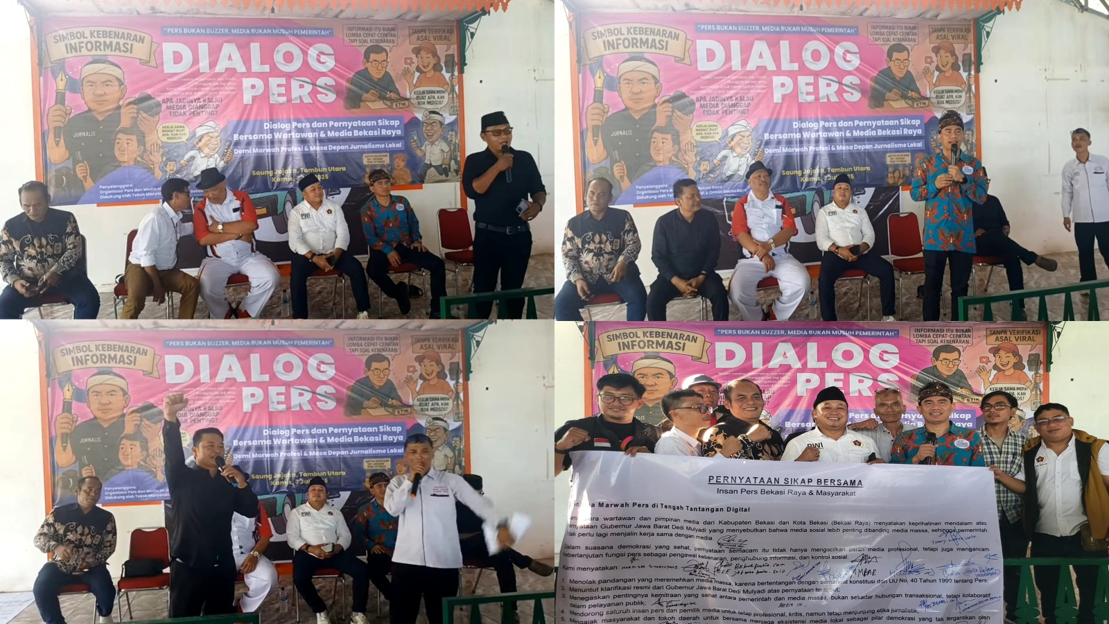 Delik Asia, (Bekasi) | Ratusan wartawan dan pimpinan media dari Kota dan Kabupaten Bekasi berkumpul dan menyatakan sikap bersama dalam Dialog Pers yang digelar di Saung Jajaka, Jalan Gabus Raya, Srijaya Kecamatan Tambun Utara, Kabupaten Bekasi Jawa Barat pada, Kamis (3/07/2025) siang.