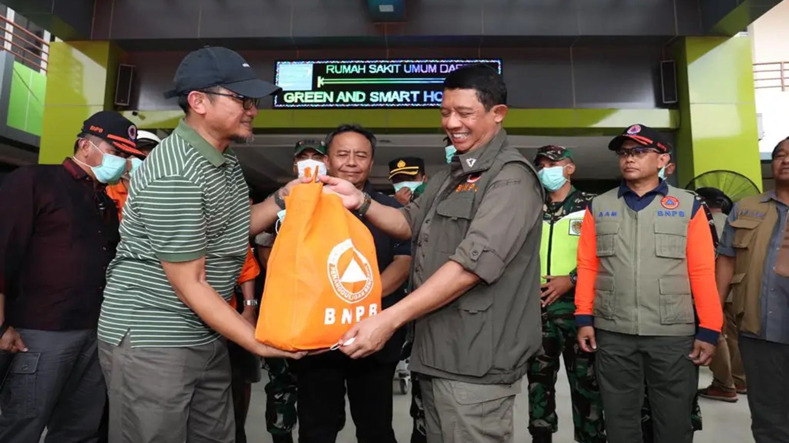 Foto : Kepala Badan Nasional Penanggulangan Bencana (BNPB) Letjen TNI Suharyanto S.Sos., M.M., menyerahkan bantuan kepada korban terdampak gempabumi berkekuatan magnitudo (M) 4.8 di Rumah Sakit Umum Daerah Sumedang Sukabumi, Jawa Barat, pada Senin (1/1).[Bidkom Kebencanaan].