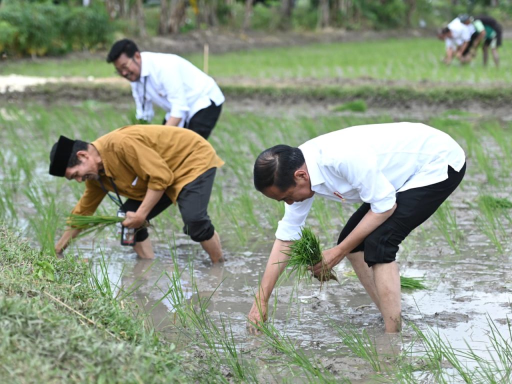 Kabupaten Tuban, (DelikAsia.com) | Mengawali kunjungan kerja (kunker) di Jawa Timur, Presiden RI Joko Widodo (Jokowi) didampingi Ibu Iriana Jokowi melakukan tanam padi bersama para petani di di Kawasan Daulat Pangan Serikat Petani Indonesia, di Desa Senori, Kecamatan Merakurak, Kabupaten Tuban, Kamis (06/04/2023) pagi. Presiden mengapresiasi para petani yang telah menggunakan pupuk organik untuk menggarap lahan seluas 1.000 hektare di kawasan tersebut.